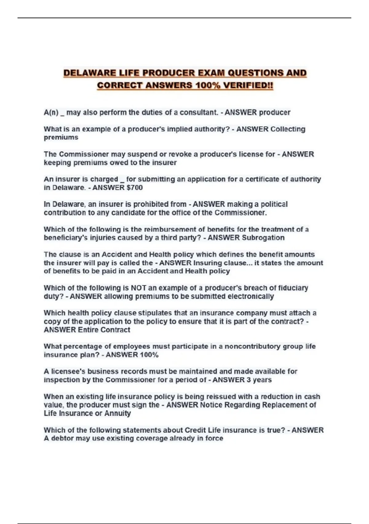 DELAWARE LIFE PRODUCER EXAM QUESTIONS AND CORRECT ANSWERS 100% VERIFIED!!...