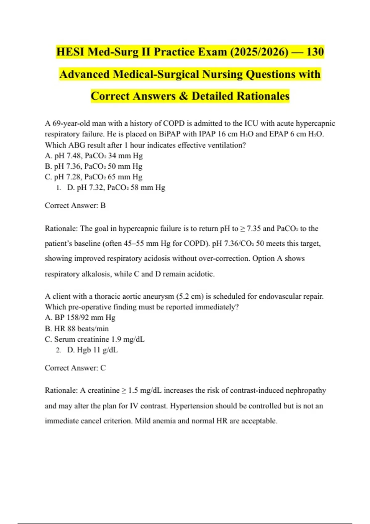 HESI Med-Surg II Practice Exam (2025/2026) — 130 Advanced Medical-Surgical Nursing Questions with Correct Answers & Detailed Rationales