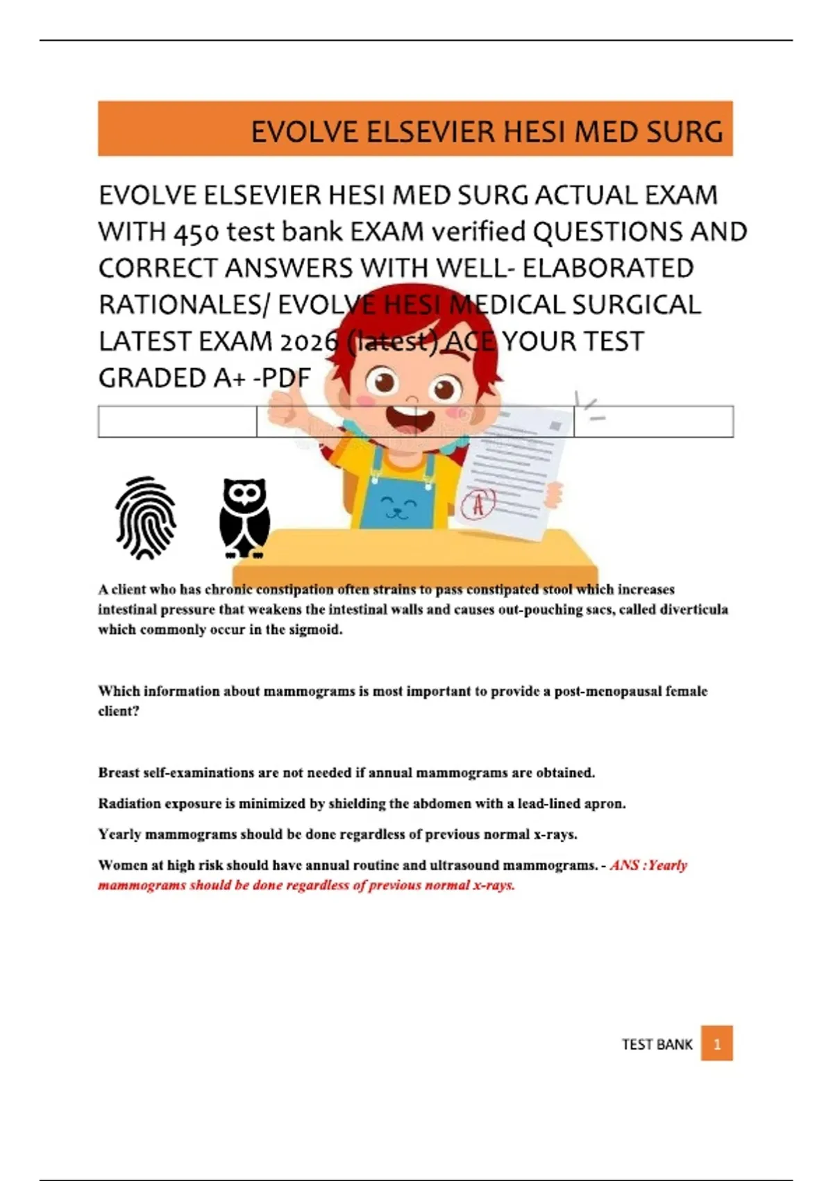 EVOLVE ELSEVIER HESI MED SURG ACTUAL EXAM WITH 450 test bank EXAM verified QUESTIONS AND CORRECT ANSWERS WITH WELL- ELABORATED RATIONALES EVOLVE HESI MEDICAL SURGICAL LATEST EXAM 2026 (latest) ACE YOUR TEST GRADED A+ -PDF