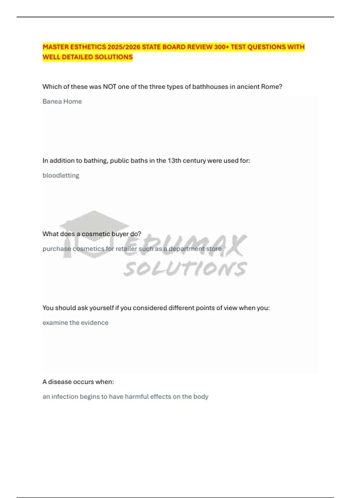 MASTER ESTHETICS 2025/2026 STATE BOARD REVIEW 300+ TEST QUESTIONS WITH WELL DETAILED SOLUTIONS