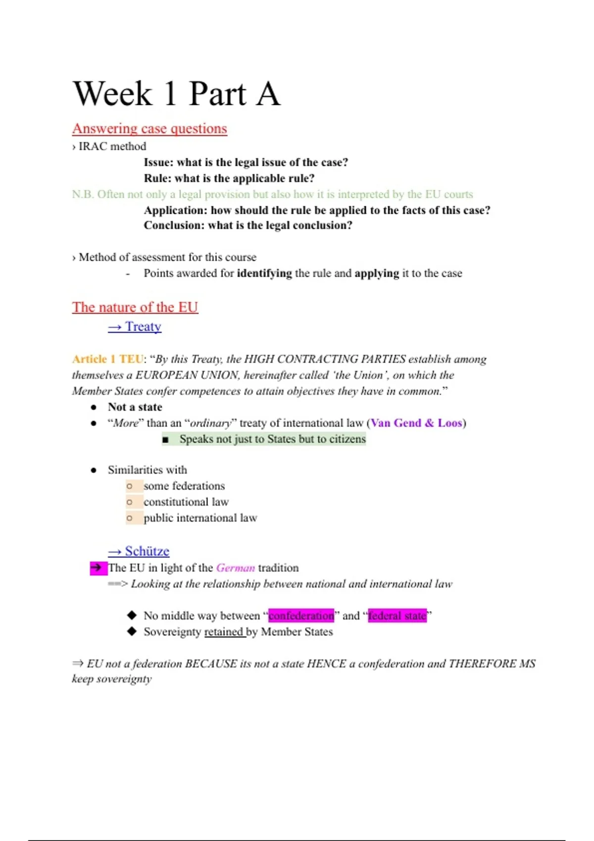 EU Law Revision Notes – Clear, Complete, and Exam-Ready! Master the Law of the European Union with my fully-organised, colour-coded notes designed to make studying faster and easier. This document includes: Detailed explanations of all key EU legal cases Relevant treaty articles clearly laid out and contextualised Concise summaries of the main course content Clean highlighting & colour-coding for effortless revision Perfect for students who want a structured, comprehensive, and visually clear guide to EU Law. Boost your understanding—and your grades—with notes that actually make sense.