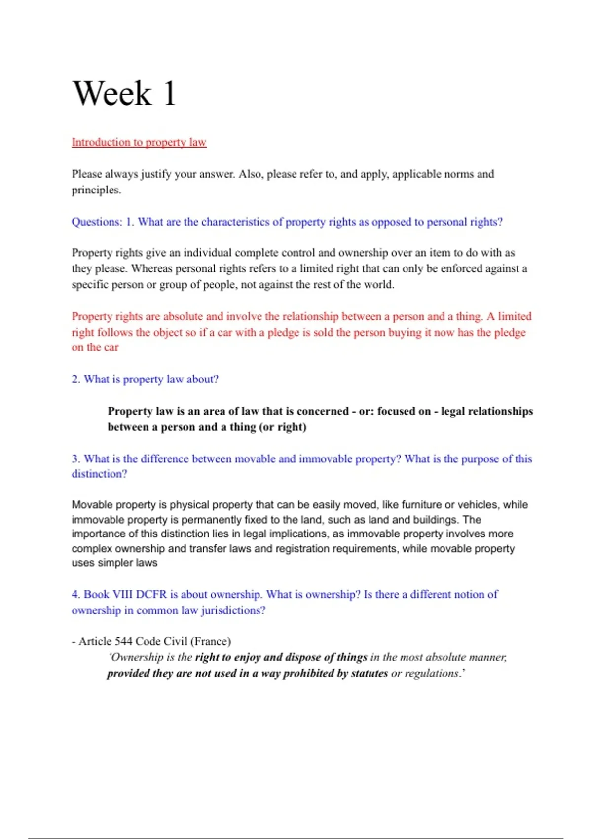 Questions: 1. What are the characteristics of property rights as opposed to personal rights?