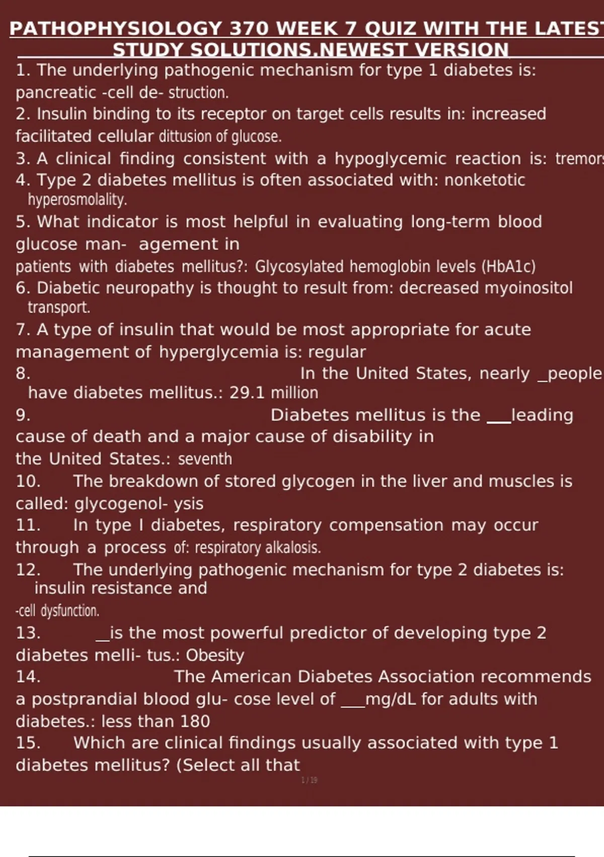 PATHOPHYSIOLOGY 370 WEEK 7 QUIZ WITH THE LATEST STUDY SOLUTIONS.NEWEST VERSION.