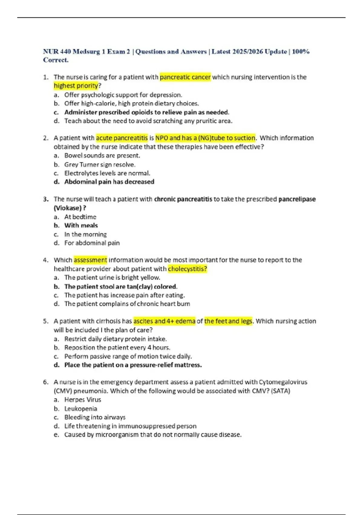 NUR 440 Medsurg 1 Exam 2 | Questions and Answers | Latest 2025/2026 Update | 100% Correct.