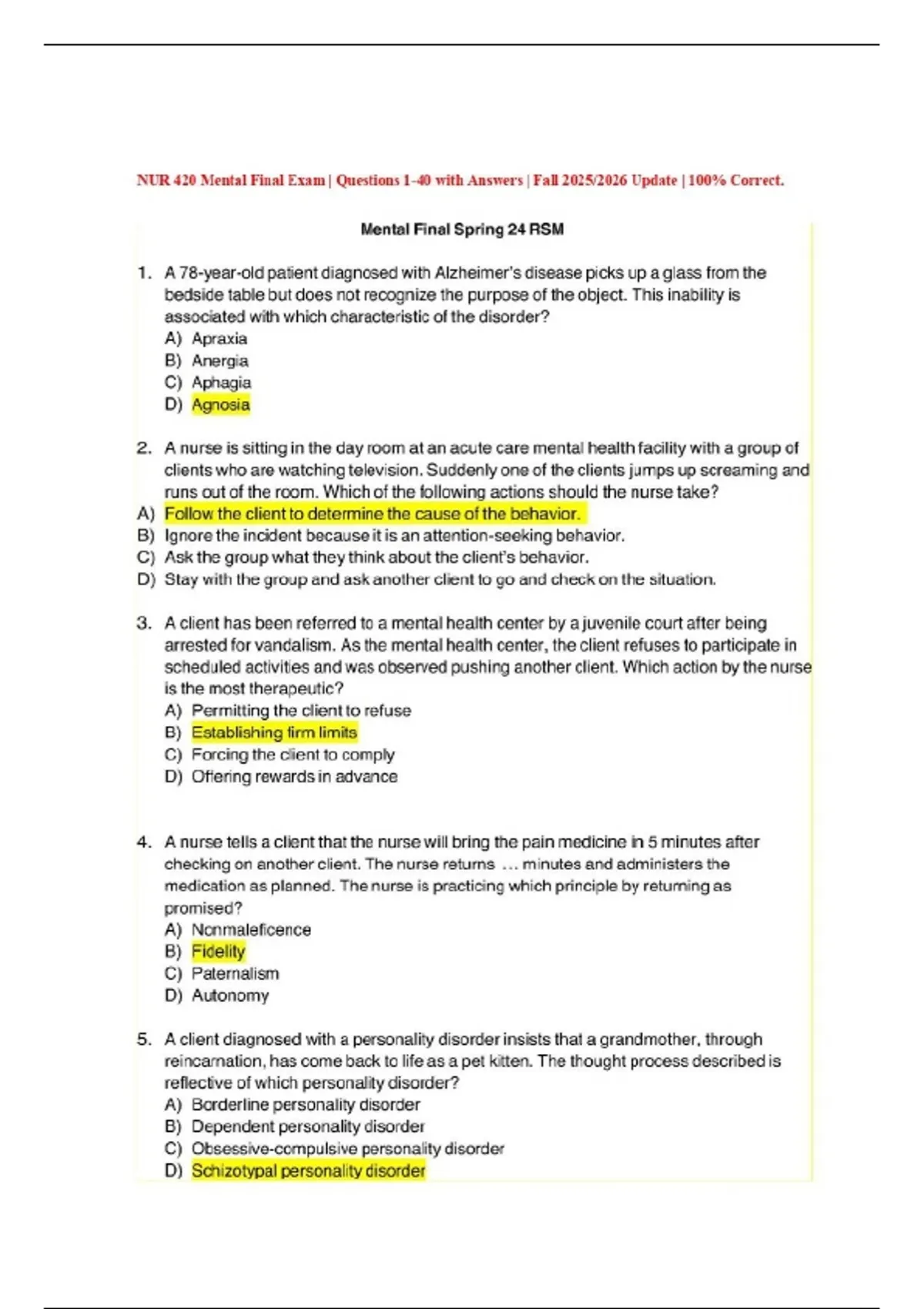 NUR 420 Mental Final Exam | Questions 1-40 with Answers | Fall 2025/2026 Update | 100% Correct.