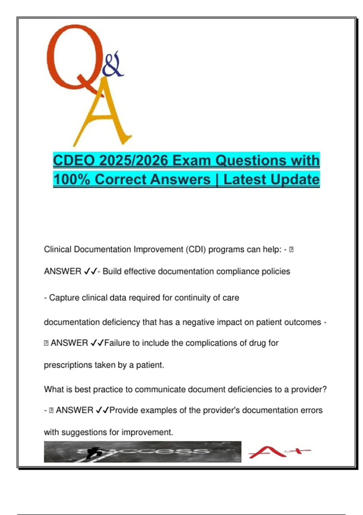 This extensive exam prep document provides over 100 expertly formulated multiple-choice questions and correct answers for the 2025/2026 CDEO (Certified Documentation Expert Outpatient) certification exam. It is aligned with the AAPC certification standards and supports mastery in areas critical to outpatient clinical documentation, coding compliance, and quality reporting. Key topics include documentation improvement programs, compliant query practices, CMS guidelines, ICD-10-CM coding accuracy, HEDIS and MIPS measures, electronic health record (EHR) standards, and risk-adjusted payment models. Additional questions cover documentation scenarios involving chronic conditions (e.g., CKD, COPD, diabetes), preventive screenings, hierarchical condition categories (HCCs), and CPT®/ICD coding for outpatient procedures. The document also explores operational aspects like the OIG Workplan, qSOFA scoring, Z-code restrictions, and STAR ratings for health plans. This document is ideal for: – Students pursuing certification through AAPC as Certified Documentation Expert Outpatient (CDEO) – Medical coding and billing students in health information technology (HIT) or HIM programs – Healthcare professionals preparing for clinical documentation roles in outpatient settings – Nursing or health sciences students learning advanced medical documentation and quality metrics – University of Phoenix learners and allied health students enrolled in coding or compliance courses Keywords: CDEO exam 2025, clinical documentation improvement, ICD-10-CM coding, CPT coding, risk adjustment, HCC coding, MIPS quality measures, HEDIS compliance, CMS query guidelines, outpatient coding, STAR ratings, AAPC exam prep, University of Phoenix, medical chart auditing, CDI scenarios, EHR compliance