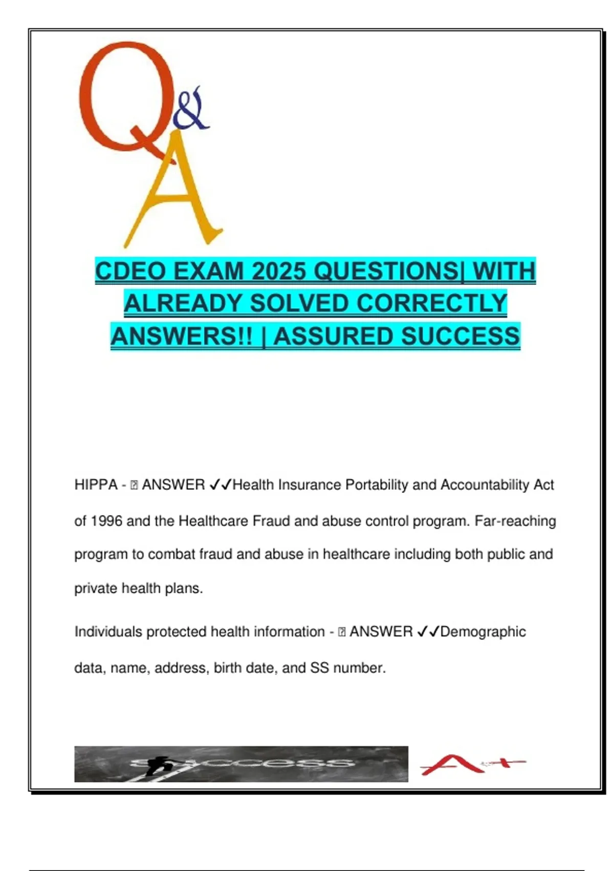 This complete exam prep guide includes over 100 accurately solved multiple-choice questions for the Certified Documentation Expert Outpatient (CDEO) exam for the 2025/2026 cycle. Developed in alignment with AAPC's credentialing standards, this document is designed to reinforce practical knowledge across key domains of clinical documentation integrity, compliance, and coding. The material offers comprehensive coverage of HIPAA privacy and security rules, documentation best practices, CDI implementation, CMS guidelines, compliant provider queries, fraud and abuse policies, and performance measurement tools such as HEDIS, MIPS, and STAR ratings. It also addresses risk adjustment models (e.g., HCC, CDPS), electronic health records, modifier use, and compliance program elements. Each question is immediately followed by the correct answer, ensuring clarity and reinforcing test-ready knowledge. Ideal for: – AAPC candidates preparing for the CDEO certification exam – Health information management (HIM) or medical billing and coding students – Clinical documentation specialists in outpatient and ambulatory settings – Healthcare compliance officers and audit professionals – University of Phoenix students in health sciences, HIT, or coding programs Keywords: CDEO 2025, clinical documentation improvement, HIPAA compliance, risk adjustment, HCC coding, CPT modifiers, ICD-10-CM, CMS guidelines, EHR documentation, MIPS, STAR ratings, HEDIS measures, AAPC certification, medical auditing, outpatient CDI