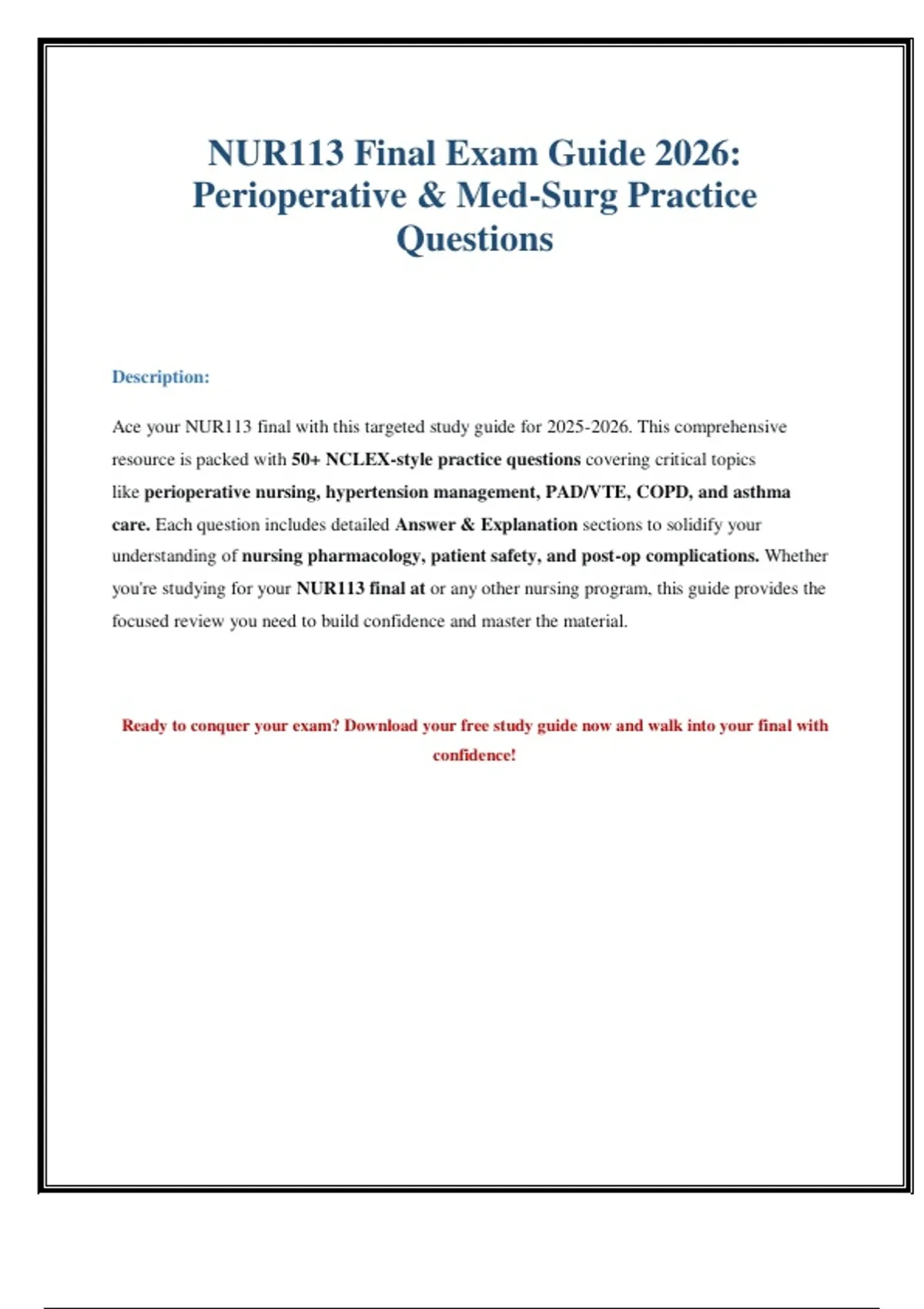 Ace your NUR113 final with this targeted study guide for . This comprehensive resource is packed with 50+ NCLEX-style practice questions covering critical topics like perioperative nursing, hypertension management, PAD/VTE, COPD, and asthma care. Each question includes detailed Answer & Explanation sections to solidify your understanding of nursing pharmacology, patient safety, and post-op complications. Whether you're studying for your NUR113 final at or any other nursing program, this guide provides the focused review you need to build confidence and master the material.