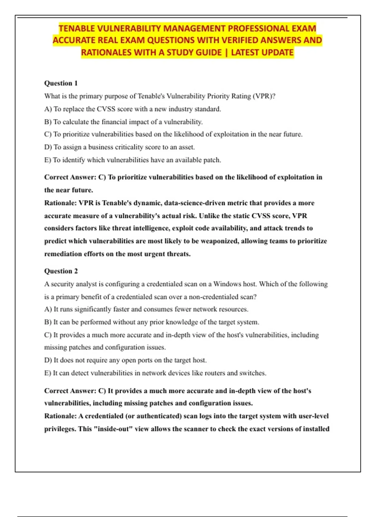 TENABLE VULNERABILITY MANAGEMENT PROFESSIONAL EXAM ACCURATE REAL EXAM QUESTIONS WITH VERIFIED ANSWERS AND RATIONALES WITH A STUDY GUIDE | LATEST UPDATE