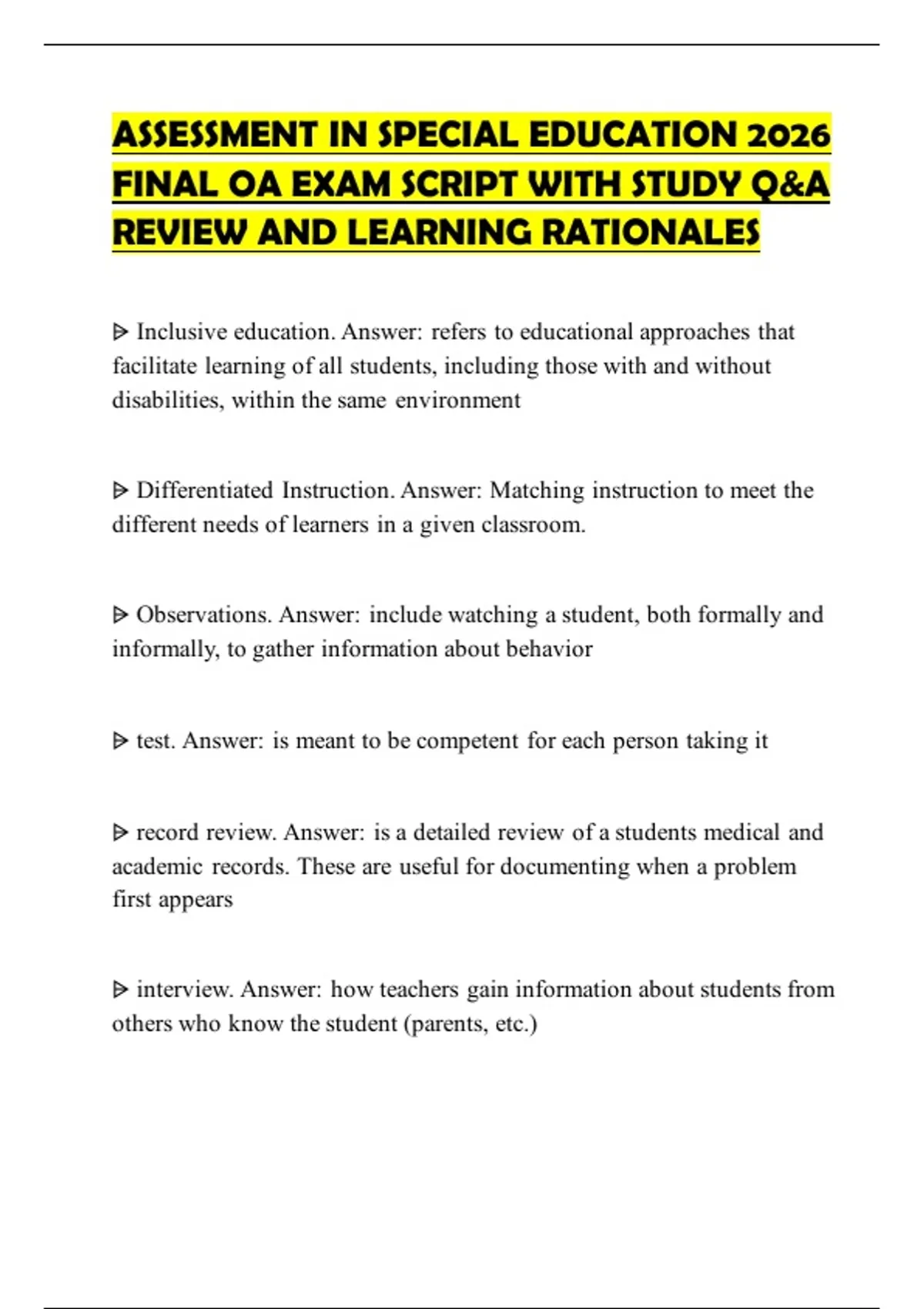 ASSESSMENT IN SPECIAL EDUCATION 2026 FINAL OA EXAM SCRIPT WITH STUDY Q&A REVIEW AND LEARNING RATIONALES