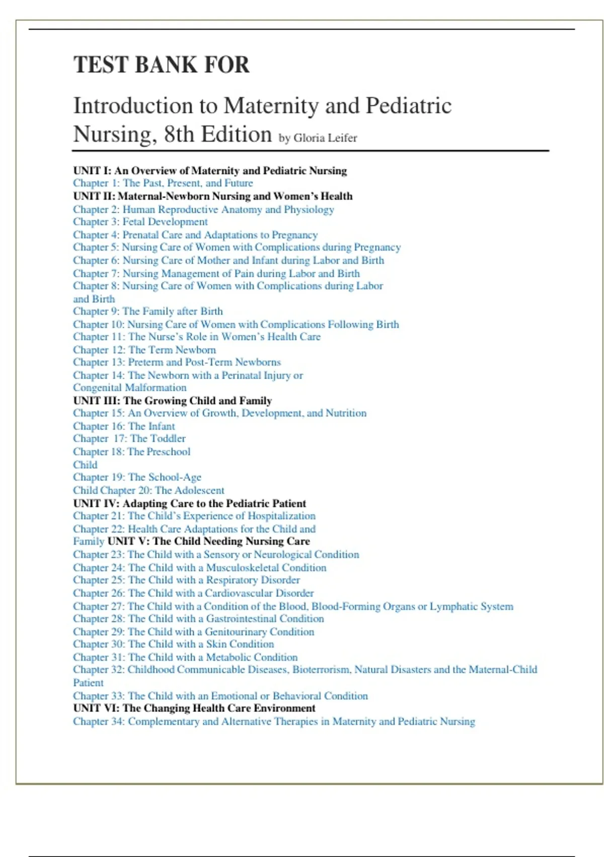 Introduction to Maternity and Pediatric Nursing Test Ban k, Gloria Leifer 8th E dition, Pediatric Nursin g Exam Prep, Maternity Nursing Study Guide, Nursing Test Ban k 2025, Pediatric and Maternal Nursing Q uestion s, Nursing Exam Practice, Gloria Leifer Nursing Test Ban k, Maternity and Pediatric Nursing Study Material, Nursing Ratio nales, Pediatric and Maternal Care Exam Review, Nursing Schoo l Test Ban k, Maternal Nurs ing Practice Questions, Pediatric Nurs ing Exam Prep, Maternity and Pediatric Nursing 2025 –2026<>