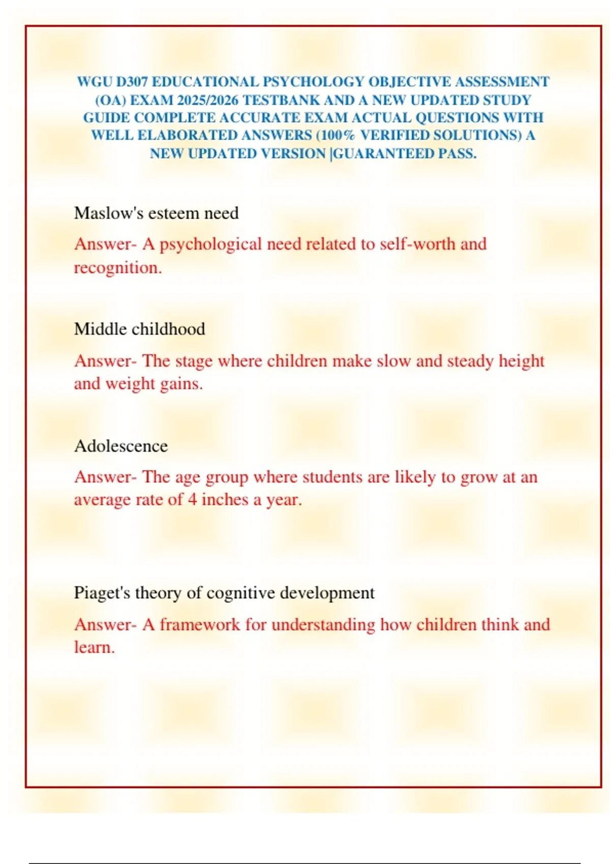 WGU D307 EDUCATIONAL PSYCHOLOGY OBJECTIVE ASSESSMENT (OA) EXAM 2025/2026 TESTBANK AND A NEW UPDATED STUDY GUIDE COMPLETE ACCURATE EXAM ACTUAL QUESTIONS WITH WELL ELABORATED ANSWERS (100% VERIFIED SOLUTIONS) A NEW UPDATED VERSION |GUARANTEED PASS.WGU D307