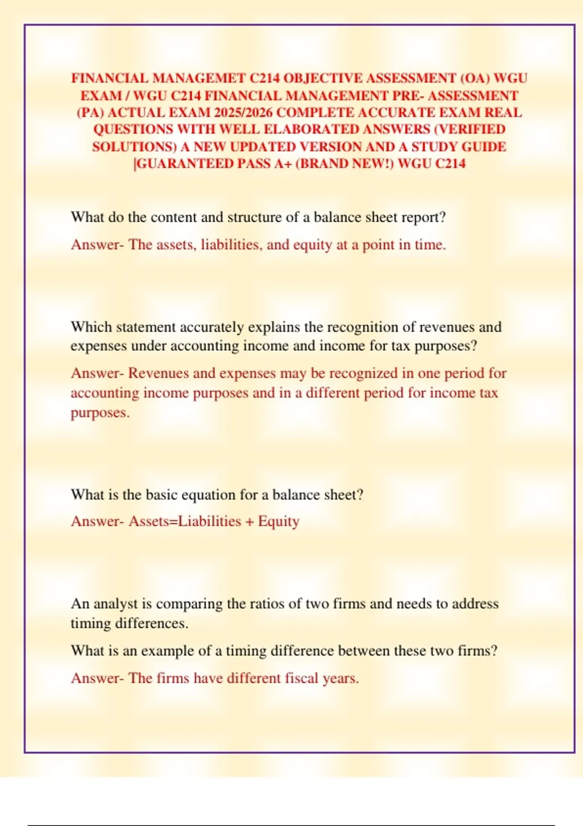EXAM / WGU C214 FINANCIAL MANAGEMENT PRE- ASSESSMENT