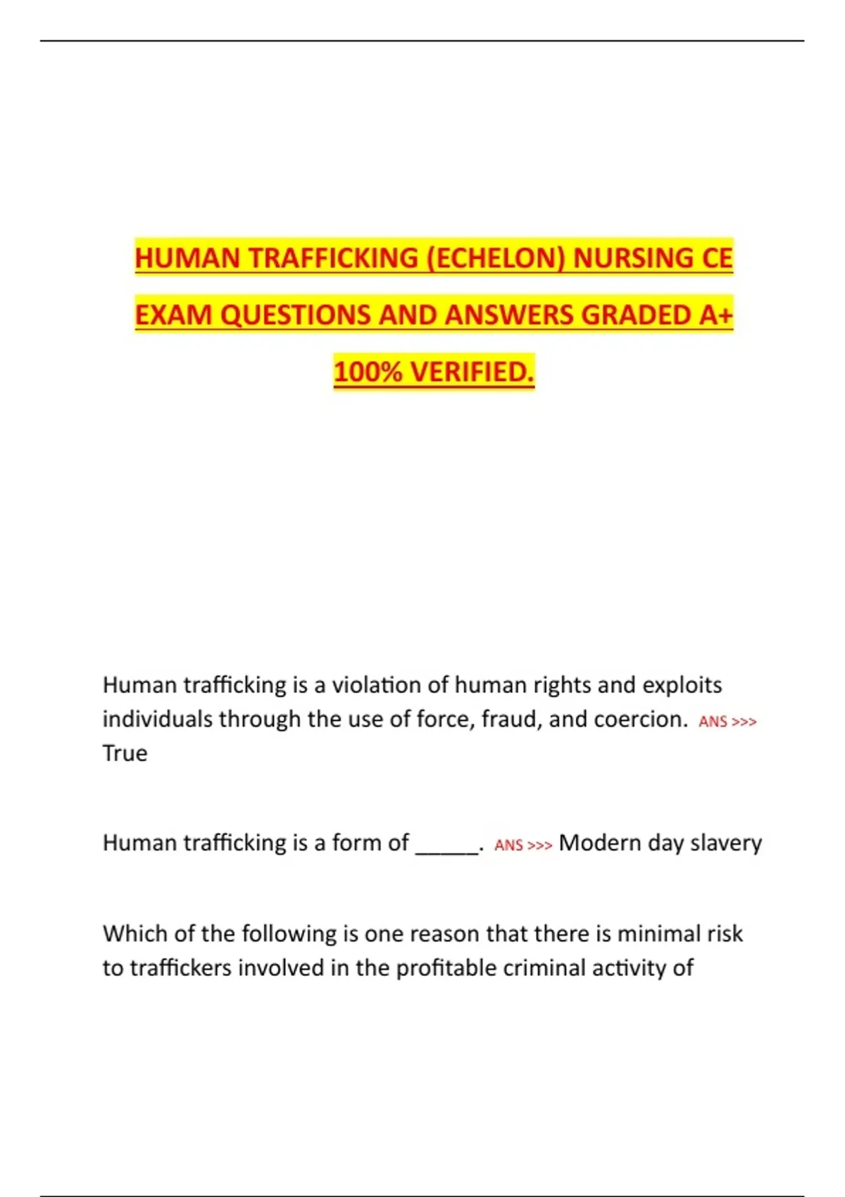 This document contains the full set of Human Trafficking Nursing CE exam questions from Echelon, complete with verified A+ graded answers. It covers essential topics including recognition of trafficking indicators, victim assessment, reporting requirements, healthcare responsibilities, and evidence-based response strategies. The material is structured for clear, reliable study and aligns with current continuing-education standards for healthcare professionals. All answers are fully verified for accuracy and clarity.
