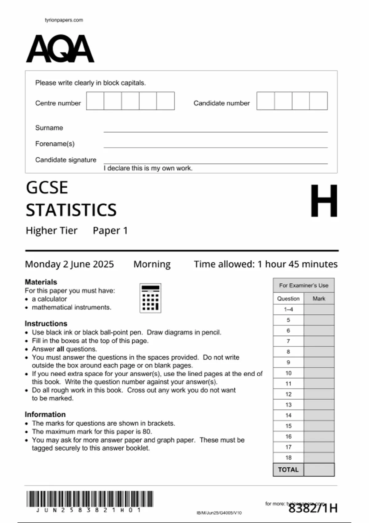 2025 AQA GCSE STATISTICS Paper 1 (8382/1H: Higher Tier)