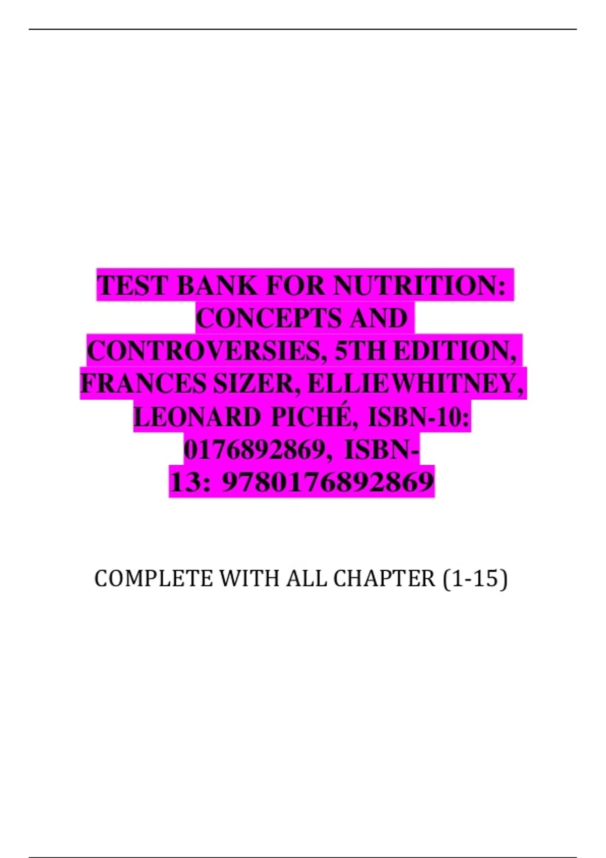 This document offers the complete test bank for Nutrition: Concepts and Controversies (5th edition), featuring exam-style multiple-choice questions across key nutrition topics. It covers energy balance, macronutrients and micronutrients, digestion, metabolism, vitamins, minerals, and dietary guidelines. The material is organized to support full-course review, exam preparation, and self-testing for students in nutrition and health science programs.