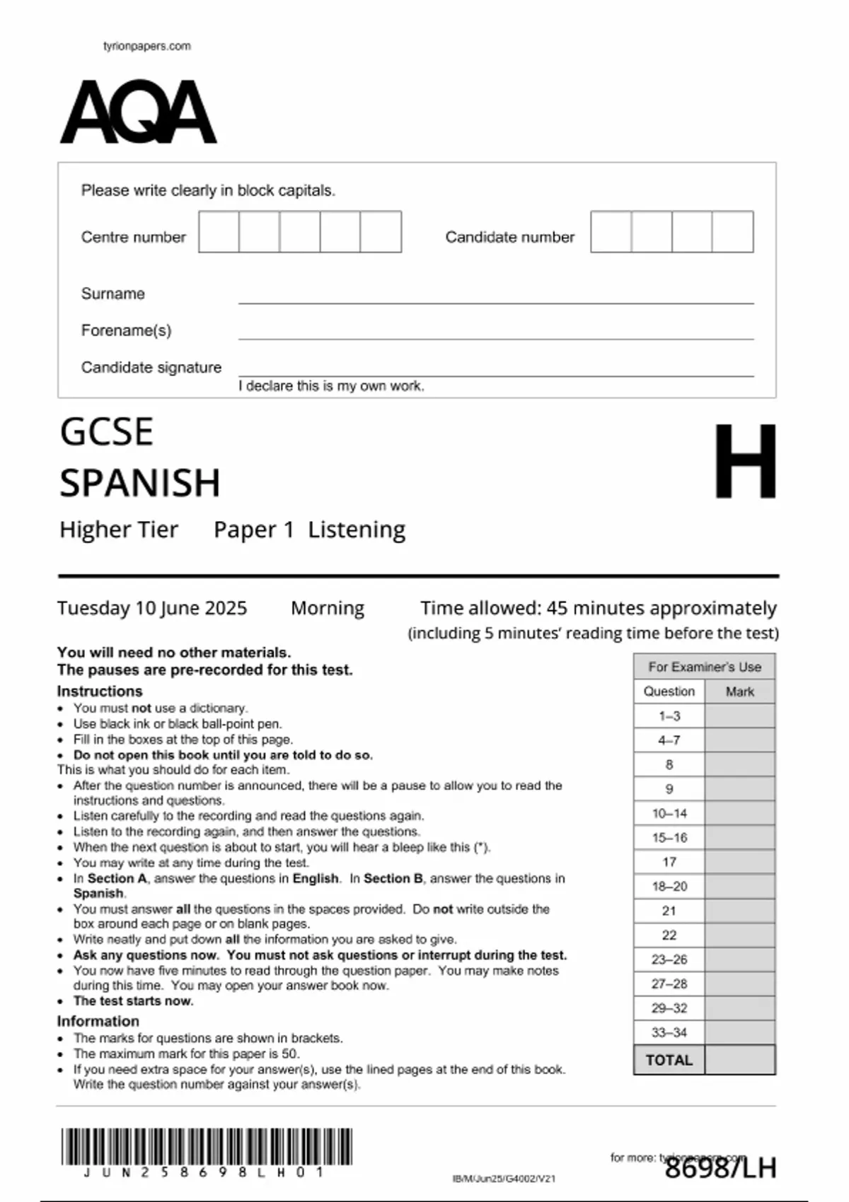 MERGED 2025 AQA GCSE SPANISH Paper 1 Question Paper and Mark Scheme (8698/LH: Listening Higher Tier)