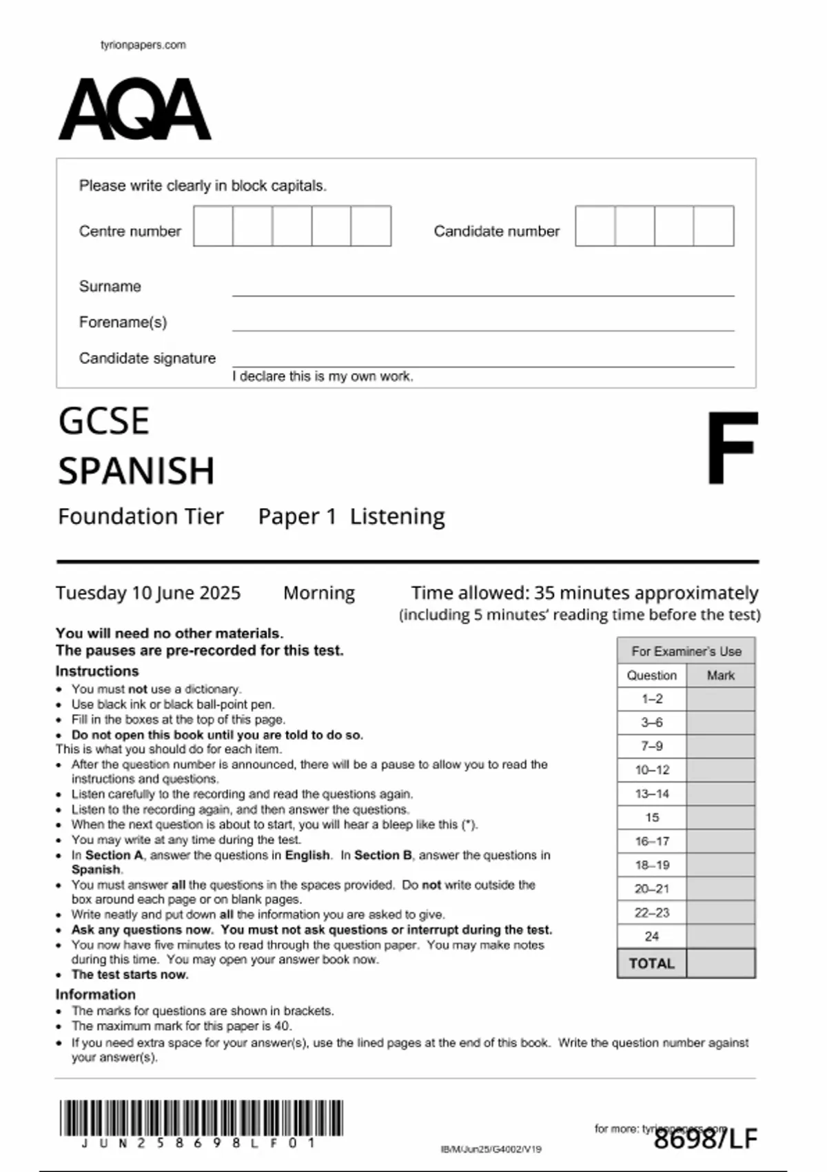 MERGED AQA GCSE SPANISH Paper 1 Question Paper and Mark Scheme (8698/LF: Listening Foundation Tier)