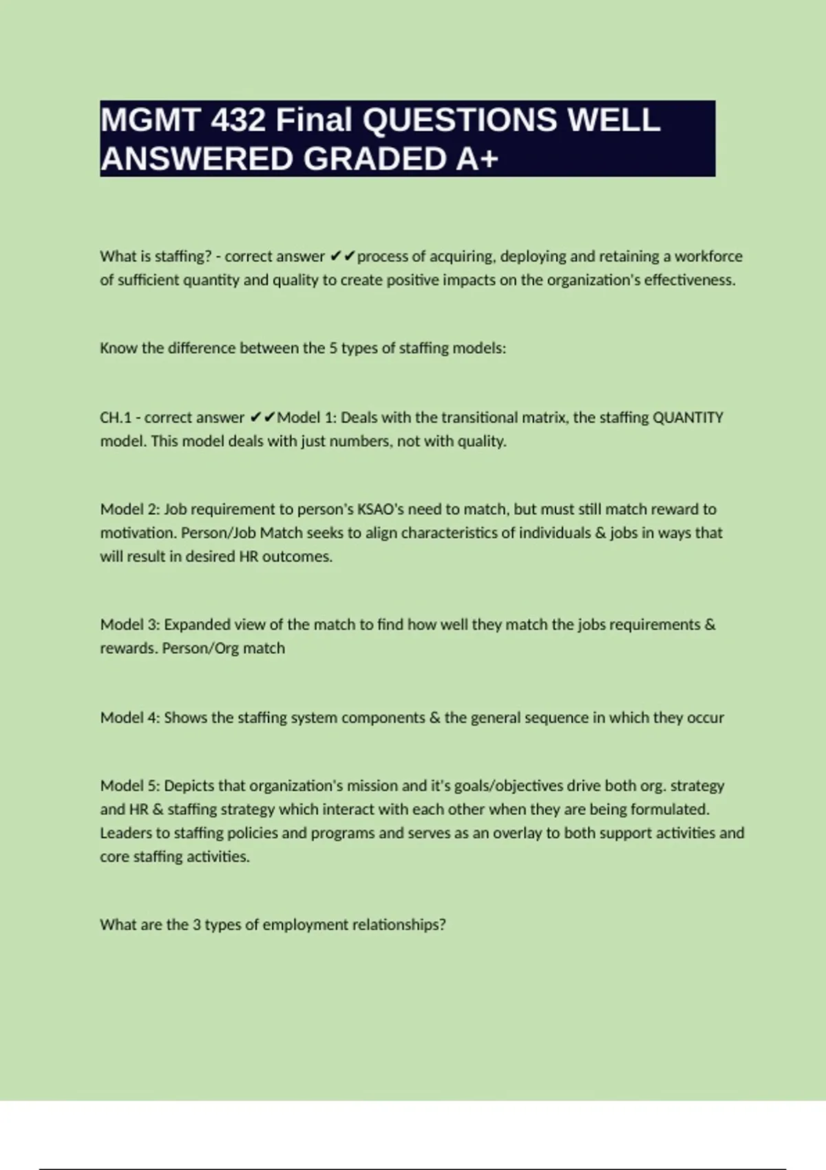 CH.1 - correct answer ✔✔Model 1: Deals with the transitional matrix, the staffing QUANTITY