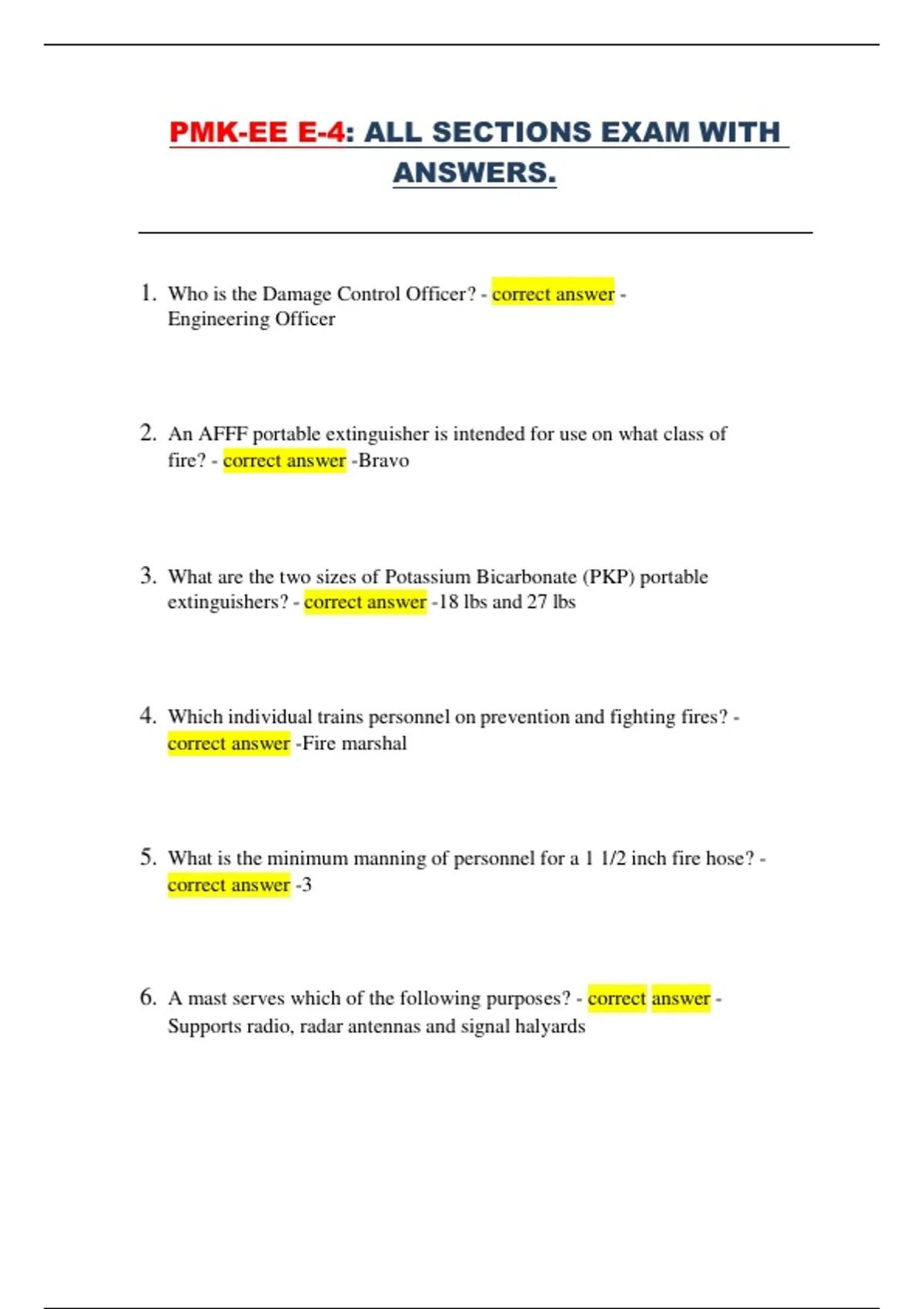 This document contains the complete set of PMK-EE E-4 exam questions with correct answers across all tested sections. It covers essential topics such as damage control, Navy administration, leadership, professional conduct, advancement procedures, uniform regulations, Navy history, security, safety, physical readiness, and personnel programs. The material provides a full, structured review aligned with official PMK-EE requirements, making it suitable for thorough preparation before taking the advancement exam.