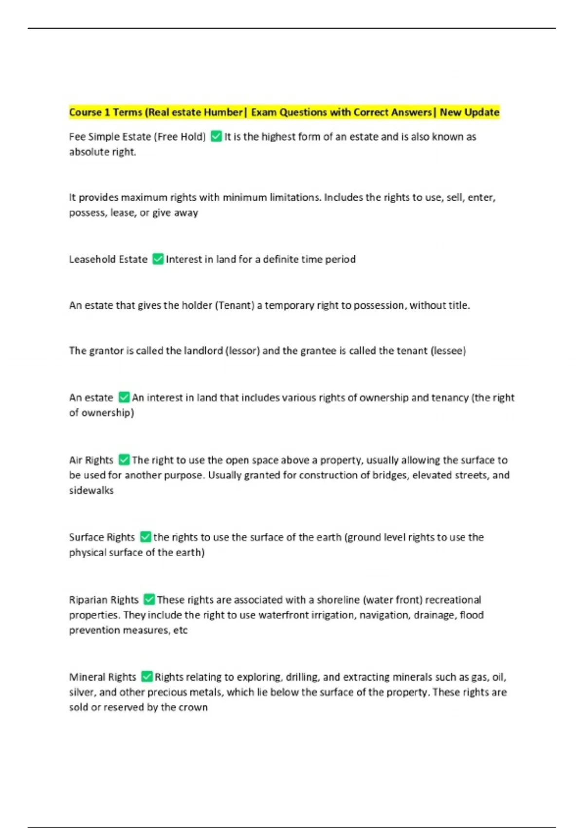 Course 1 Terms (Real estate Humber| Exam Questions with Correct Answers| New Update