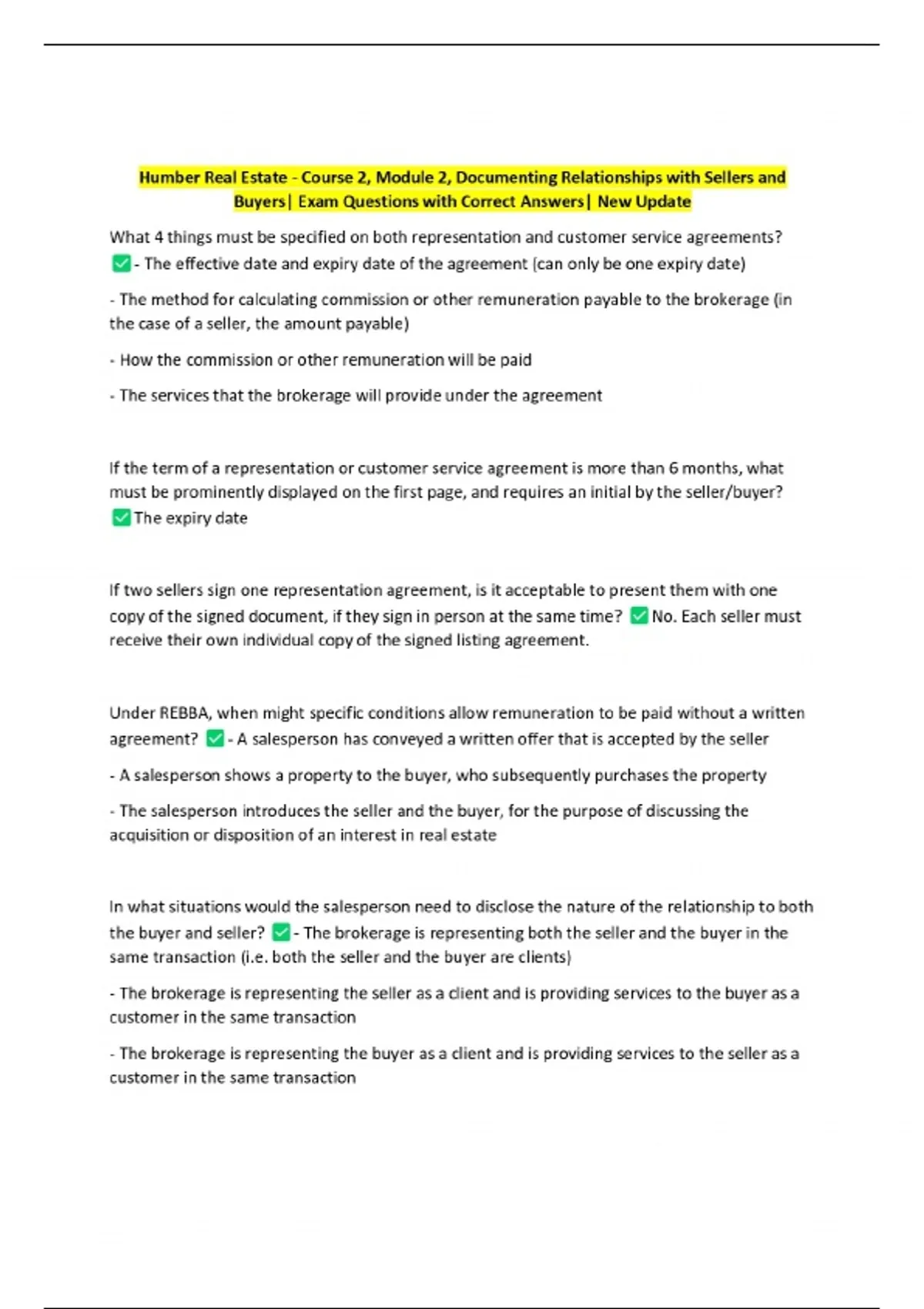Humber Real Estate - Course 2, Module 2, Documenting Relationships with Sellers and Buyers| Exam Questions with Correct Answers| New Update
