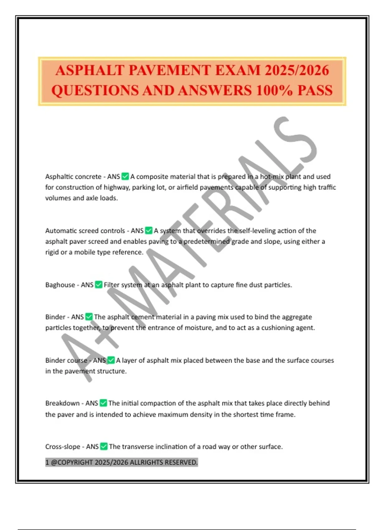 ASPHALT PAVEMENT EXAM 2025/2026 QUESTIONS AND ANSWERS 100% PASS