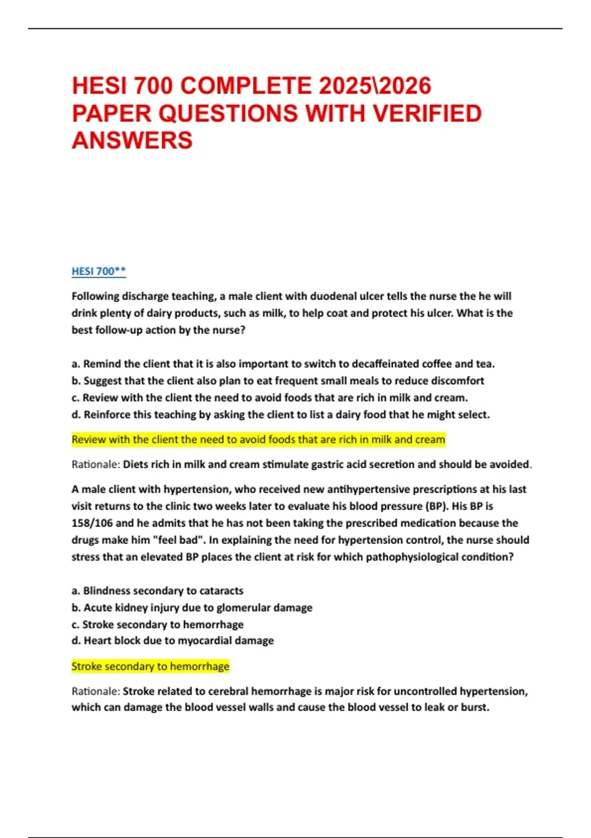 HESI 700 COMPLETE PAPER QUESTIONS WITH VERIFIED ANSWERS || 100% PASS || VERIFIED HESI EXAM QUESTIONS HESI 700** Following discharge teaching, a male client with duodenal ulcer tells the nurse the he will drink plenty of dairy products, such as milk, to help coat and protect his ulcer. What is the best follow-up action by the nurse? a. Remind the client that it is also important to switch to decaffeinated coffee and tea. b. Suggest that the client also plan to eat frequent small meals to reduce discomfort c. Review with the client the need to avoid foods that are rich in milk and cream. d. Reinforce this teaching by asking the client to list a dairy food that he might select. Review with the client the need to avoid foods that are rich in milk and cream Rationale: Diets rich in milk and cream stimulate gastric acid secretion and should be avoided. A male client with hypertension, who received new antihypertensive prescriptions at his last visit returns to the clinic two weeks later to evaluate his blood pressure (BP). His BP is 158/106 and he admits that he has not been taking the prescribed medication because the drugs make him "feel bad". In explaining the need for hypertension control, the nurse should stress that an elevated BP places the client at risk for which pathophysiological condition? a. Blindness secondary to cataracts b. Acute kidney injury due to glomerular damage c. Stroke secondary to hemorrhage d. Heart block due to myocardial damage Stroke secondary to hemorrhage Rationale: Stroke related to cerebral hemorrhage is major risk for uncontrolled hypertension, which can damage the blood vessel walls and cause the blood vessel to leak or burst. The nurse observes an unlicensed assistive personnel (UAP) positioning a newly admitted client who has a seizure disorder. The client is supine and the UAP is placing soft pillows along the side rails. What action should the nurse implement? a. Ensure that the UAP has placed the pillows effectively to protect the client. b. Instruct the UAP to obtain soft blankets to secure to the side rails instead of pillows. c. Assume responsibility for placing the pillows while the UAP completes another task. d. Ask the UAP to use some of the pillows to prop the client in a side lying position. Instruct the UAP to obtain soft blankets to secure to the side rails instead of pillows Rationale: The nurse should instruct the UAP to pad the side rails with soft blankest because the use of pillows could result in suffocation and would need to be removed at the onset of the seizure. The nurse can delegate paddling the side rails to the UAP An adolescent with major depressive disorder has been taking duloxetine (Cymbalta) for the past 12 days. Which assessment finding requires immediate follow-up? a. Describes life without purpose b. Complains of nausea and loss of appetite c. States is often fatigued and drowsy d. Exhibits an increase in sweating. Describes life without purpose Rationale: Cymbalta is a selective serotonin and norepinephrine reuptake inhibitor that is known to increase the risk of suicidal thinking in adolescents and young adults with major depressive disorder. B, C and D are side effects A 60-year-old female client with a positive family history of ovarian cancer has developed an abdominal mass and is being evaluated for possible ovarian cancer. Her Papanicolau (Pap) smear results are negative. What information should the nurse include in the client's teaching plan a. Further evaluation involving surgery may be needed b. A pelvic exam is also needed before cancer is ruled out c. Pap smear evaluation should be continued every six month d. One additional negative pap smear in six months is needed. Further evaluation involving surgery may be needed Rationale: An abdominal mass in a client with a family history for ovarian cancer should be evaluated carefully A client who recently underwent a tracheostomy is being prepared for discharge to home. Which instructions is most important for the nurse to include in the discharge plan? a. Explain how to use communication tools. b. Teach tracheal suctioning techniques c. Encourage self-care and independence. d. Demonstrate how to clean tracheostomy site. Teach tracheal suctioning techniques Rationale: Suctioning helps to clear secretions and maintain an open airway, which is critical. In assessing an adult client with a partial rebreather mask, the nurse notes that the oxygen reservoir bag does not deflate completely during inspiration and the client's respiratory rate is 14 breaths / minute. What action should the nurse implement a. Encourage the client to take deep breaths b. Remove the mask to deflate the bag c. Increase the liter flow of oxygen d. Document the assessment data Document the assessment data Rational: reservoir bag should not deflate completely during inspiration and the client's respiratory rate is within normal limits. During shift report, the central electrocardiogram (EKG) monitoring system alarms. Which client alarm should the nurse investigate first? a. Respiratory apnea of 30 seconds b. Oxygen saturation rate of 88% c. Eight premature ventricular beats every minute d. Disconnected monitor signal for the last 6 minutes. Respiratory apnea of 30 seconds Rationale: The priority is the client whose alarm indicating respiratory apnea that should be assessed first. During a home visit, the nurse observed an elderly client with diabetes slip and fall. What action should the nurse take first? a. Give the client 4 ounces of orange juice b. Call 911 to summon emergency assistance c. Check the client for lacerations or fractures d. Asses clients blood sugar level Check the client for lacerations or fractures Rationale: After the client falls, the nurse should immediately assess for the possibility of injuries and provide first aid as needed At 0600 while admitting a woman for a schedule repeat cesarean section (C-Section), the client tells the nurse that she drank a cup a coffee at 0400 b