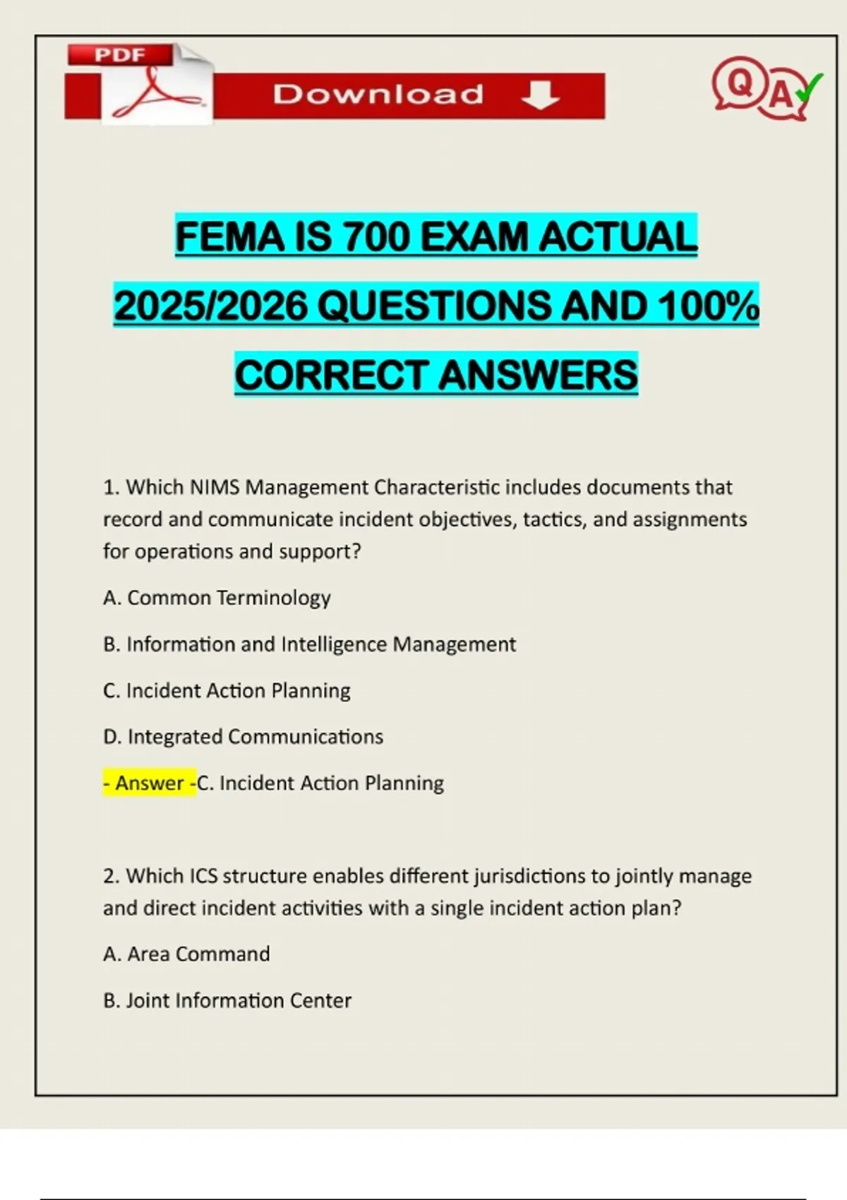 FEMA IS 700 EXAM ACTUAL 2025/2026 QUESTIONS AND 100% CORRECT ANSWERS 1. Which NIMS Management Characteristic includes documents that record and communicate incident objectives, tactics, and assignments for operations and support? A. Common Terminology B. Information and Intelligence Management C. Incident Action Planning D. Integrated Communications - Answer -C. Incident Action Planning 2. Which ICS structure enables different jurisdictions to jointly manage and direct incident activities with a single incident action plan? A. Area Command B. Joint Information CenterNeed assistance on Online classes, Exams & Assignments? Reach out for instant help!! Full Course Assistance, Plagiarism-free Essay Writing, Research Paper, Dissertation, Discussion Posts, etc…. Confidential & Secure services. Tutors are available for all subjects! Email now at: C. Unified Command D. Incident Management Team - Answer -C. Unified Command 3. Which NIMS Management Characteristic follows established processes for gathering, analyzing, assessing, sharing, and managing data? A. Common Terminology