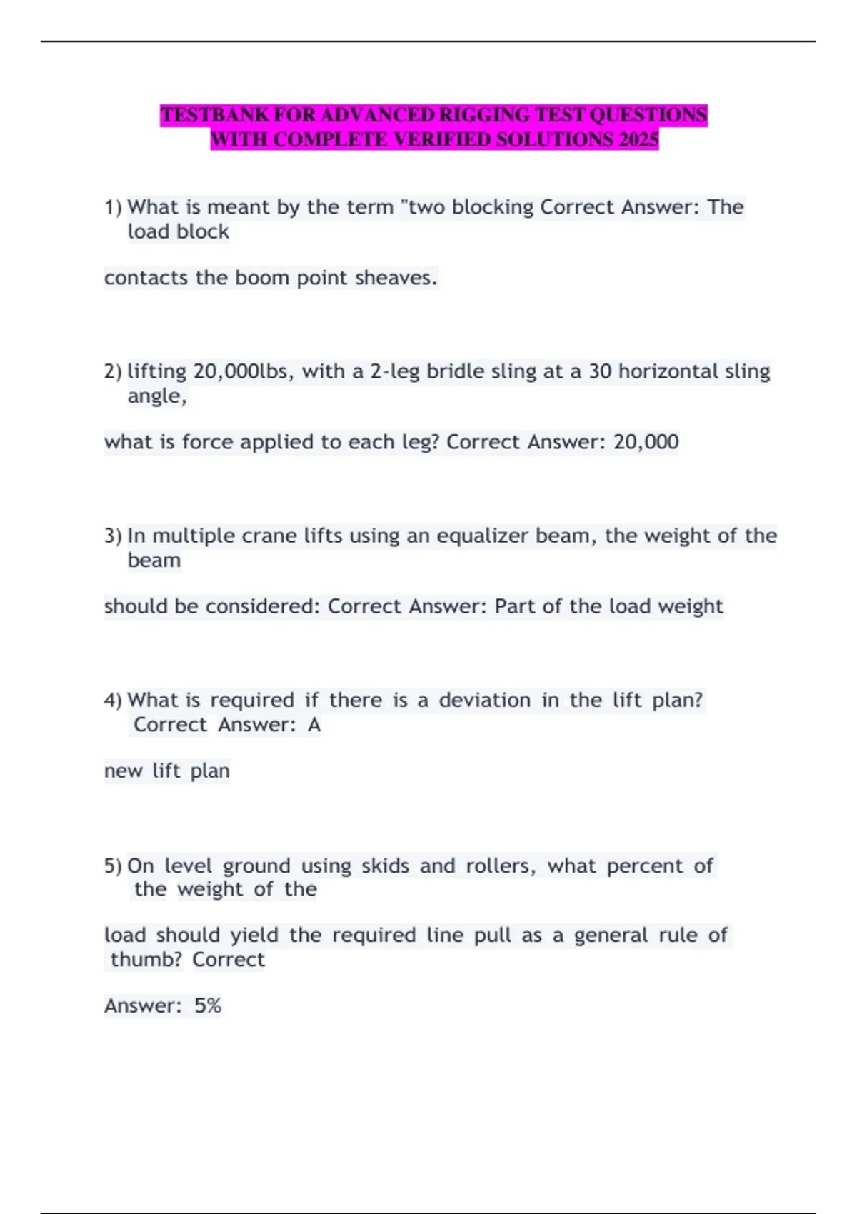 This test bank for Advanced Rigging provides students with complete verified solutions for all test questions. Designed for 2025 exam preparation, it helps strengthen understanding, improve retention, and build confidence. Ideal for thorough review and efficient exam readiness.