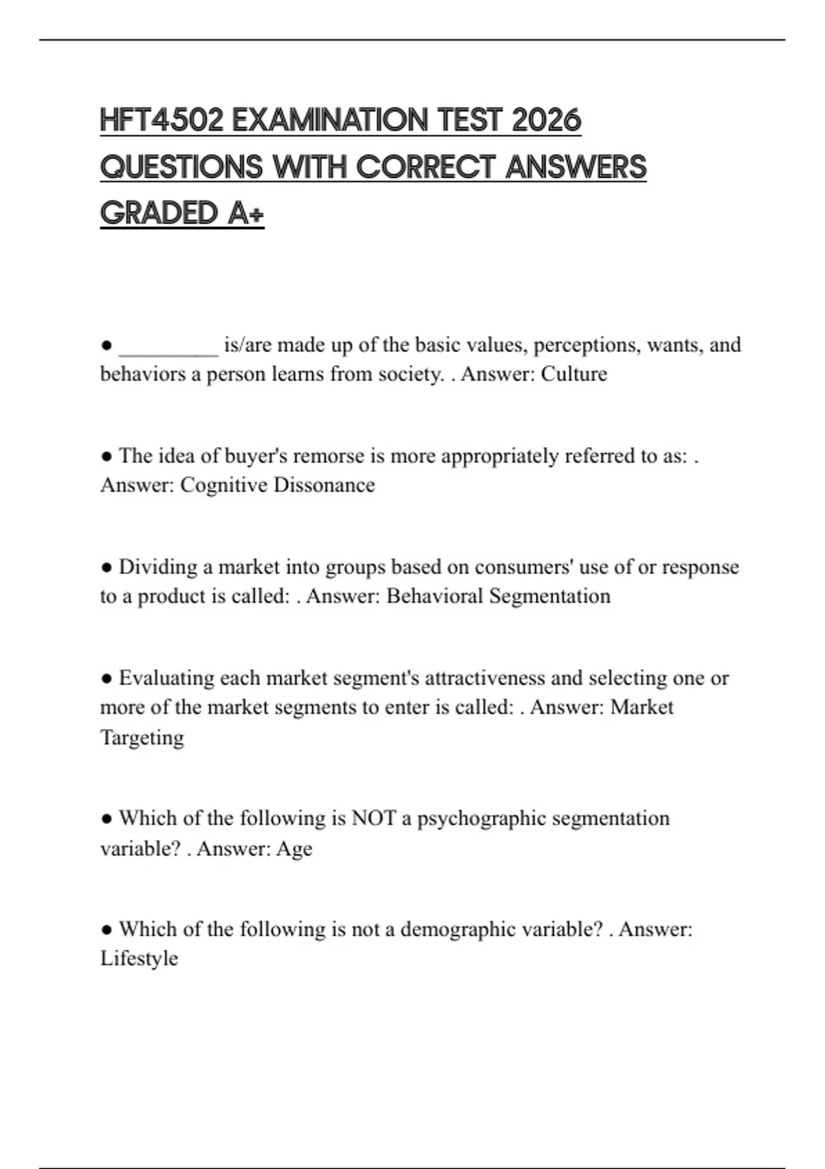 HFT4502 EXAMINATION TEST 2026 QUESTIONS WITH CORRECT ANSWERS GRADED A+