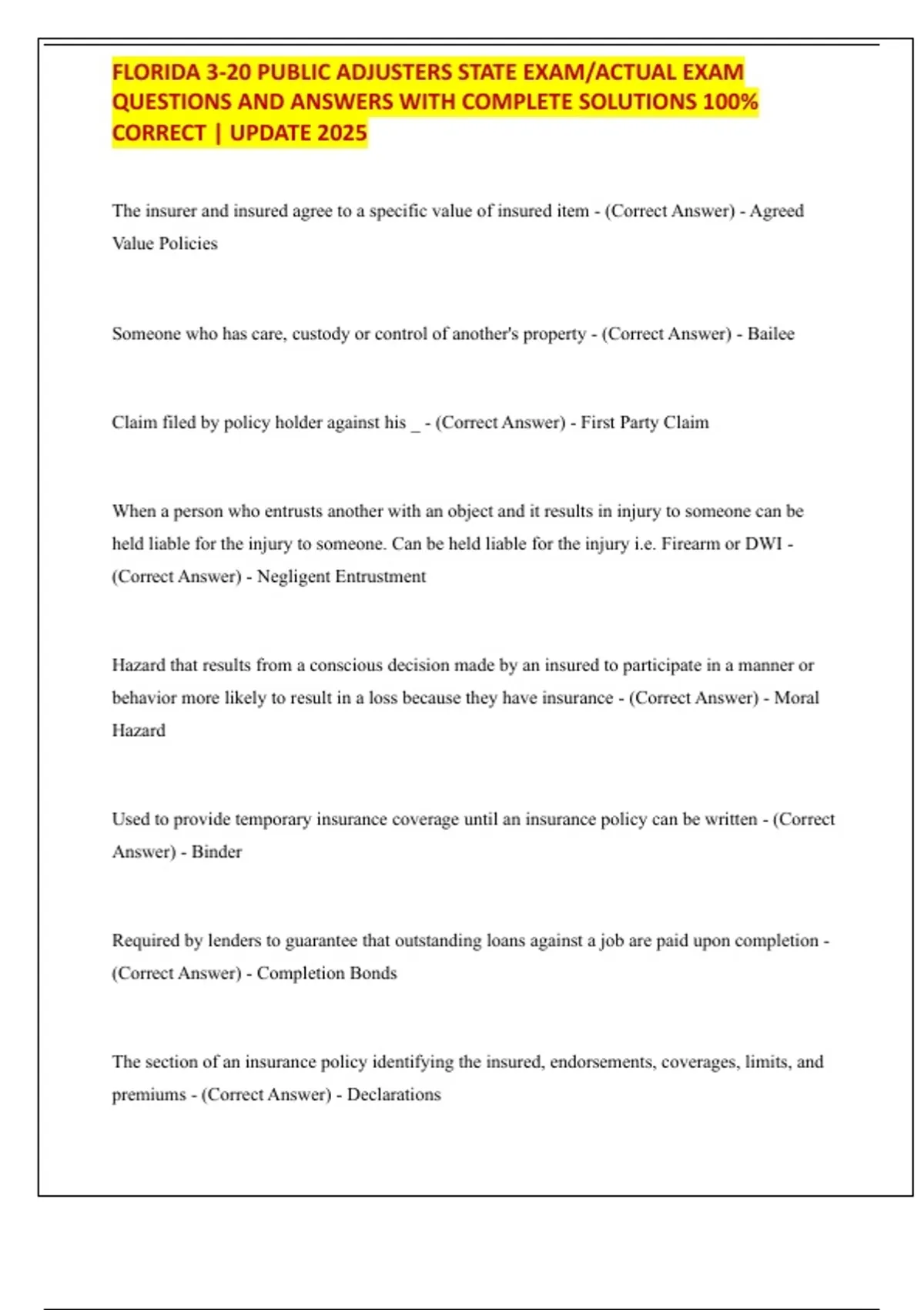 The insurer and insured agree to a specific value of insured item - (Correct Answer) - Agreed