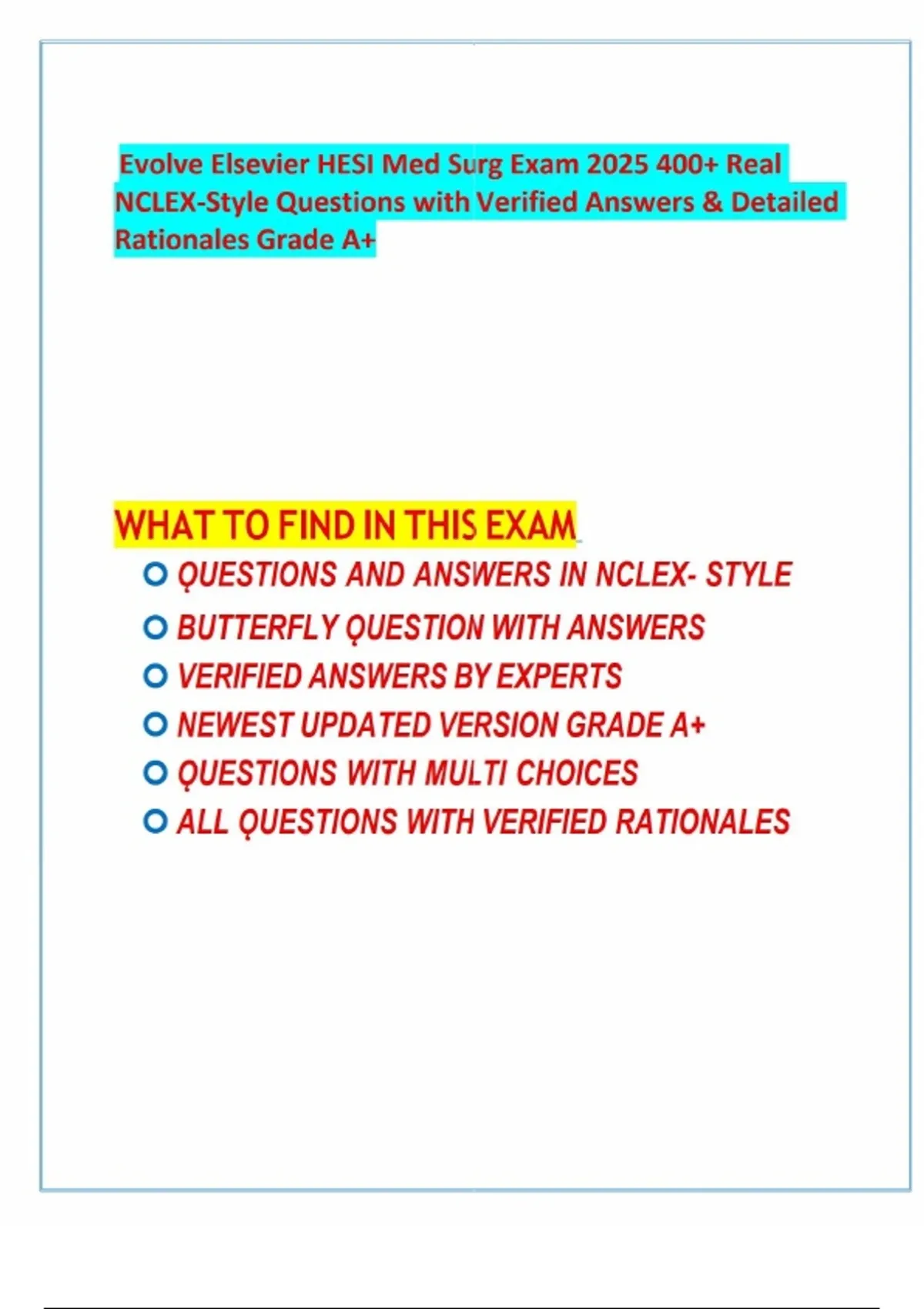 Evolve Elsevier HESI Med Surg Exam 2025 400+ Real NCLEX Style Questions with Verified Answers & Detailed Rationales Grade A+Complete test bank for the Evolve Elsevier HESI Medical Surgical Exam (2025) — brand new, fully updated, and verified by experts. What’s Inside: - 400+ real exam questions in NCLEX‑style format - Butterfly questions with correct answers - Verified answers with detailed rationales for every question - Newest updated version, graded A+ - Multi‑choice format to mirror actual exam conditions Sample Topics Covered: - Neurology: Stroke manifestations (carotid bruit, global aphasia) - Imaging Prep: CT scan interventions and patient safety - Cardiac & Respiratory: Hypertension, emphysema, and pulmonary care - GI & GU: Diverticulitis emergencies, BUN elevation causes - Musculoskeletal: Compartment syndrome recognition and amputation care - Endocrine: Cushing syndrome monitoring and diabetes management - Geriatrics: Center of gravity changes and fall risk prevention Features: - Real exam prep questions with verified answers - Well‑elaborated rationales for deeper understanding - Grade A+ content, updated for 2025 - Saves hours of study time with concise explanations - Perfect for HESI exam prep, NCLEX review, and nursing assignments