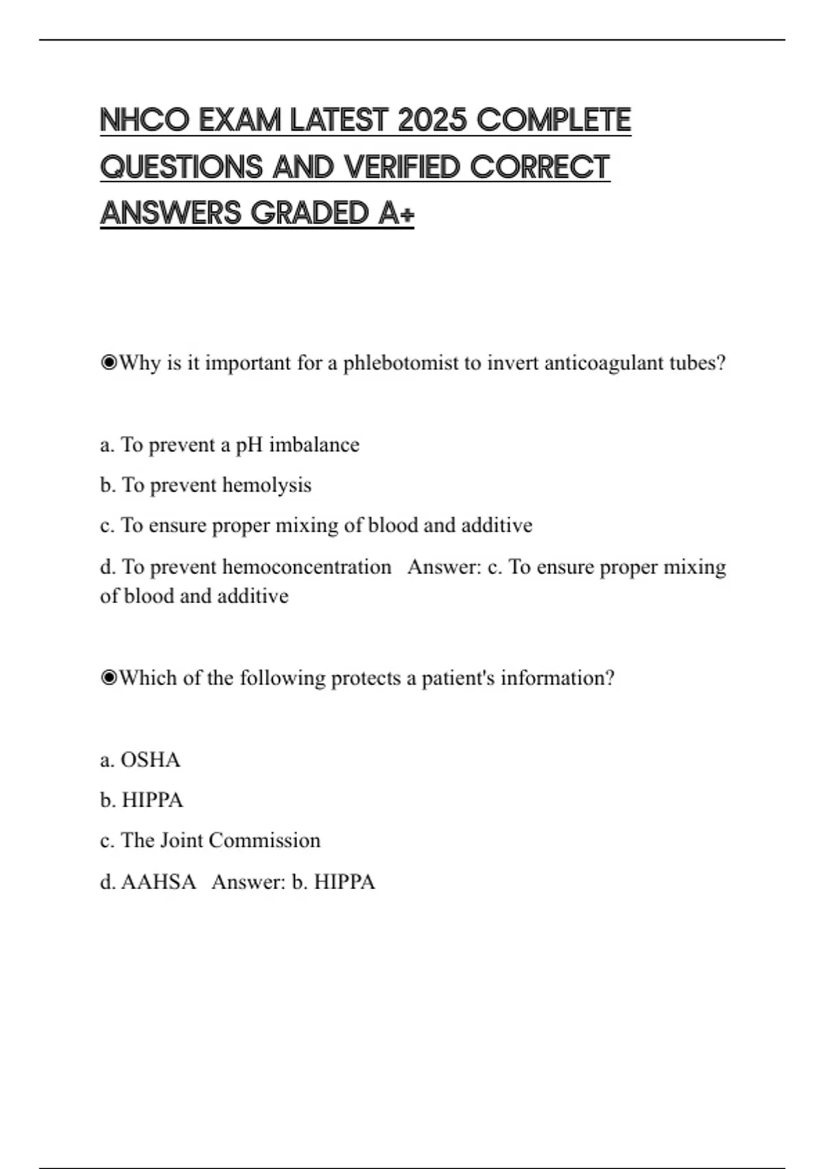 NHCO EXAM LATEST 2025 COMPLETE QUESTIONS AND VERIFIED CORRECT ANSWERS GRADED A+