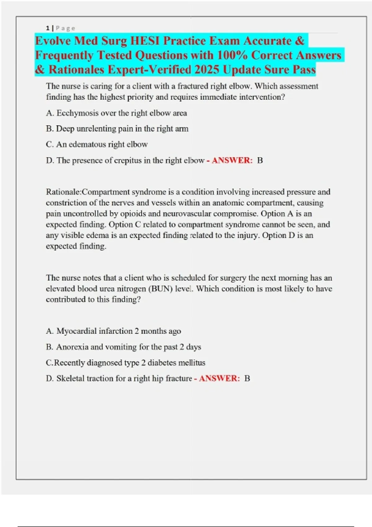 Evolve Med Surg HESI Practice Exam Accurate & Frequently Tested Questions with 100% Correct Answers & Rationales Expert‑Verified 2025 Update Sure Pass Complete practice exam for the Evolve Med Surg HESI Exam, fully updated and verified by experts. What’s Inside: - Accurate and frequently tested questions - 100% correct answers with detailed rationales - Expert‑verified solutions for guaranteed reliability - Latest and complete update (2025) - Sure Pass Guarantee — Grade A+ Sample Topics Covered: - Orthopedic trauma: Compartment syndrome recognition (deep unrelenting pain requiring immediate intervention) - Renal function: Elevated BUN linked to dehydration from vomiting - Respiratory care: Emphysema management through pacing activities and rest - Endocrine: Cushing syndrome monitoring with daily blood glucose checks - Oncology unit safety: Continuous epidural morphine infusion → highest priority assessment - Renal pathology: Acute tubular necrosis → nephron obstruction requiring temporary dialysis - Post‑operative infection prevention: Oral care, incentive spirometer, NG tube management after esophagogastrostomy - Amputation care: Correct wrapping technique anchored at the waist - Geriatrics: Center of gravity shifts to upper torso in older adults - Pharmacology: Ramipril administration with normal BP → continue scheduled dose - Neurology: Trigeminal neuralgia → facial spasms and sudden facial pain Features: - Accurate, exam‑style questions - Verified answers with rationales for deeper understanding - Grade A+ content, updated for 2025 - Saves hours of study time with concise explanations - Perfect for HESI exam prep, NCLEX review, and nursing assignments