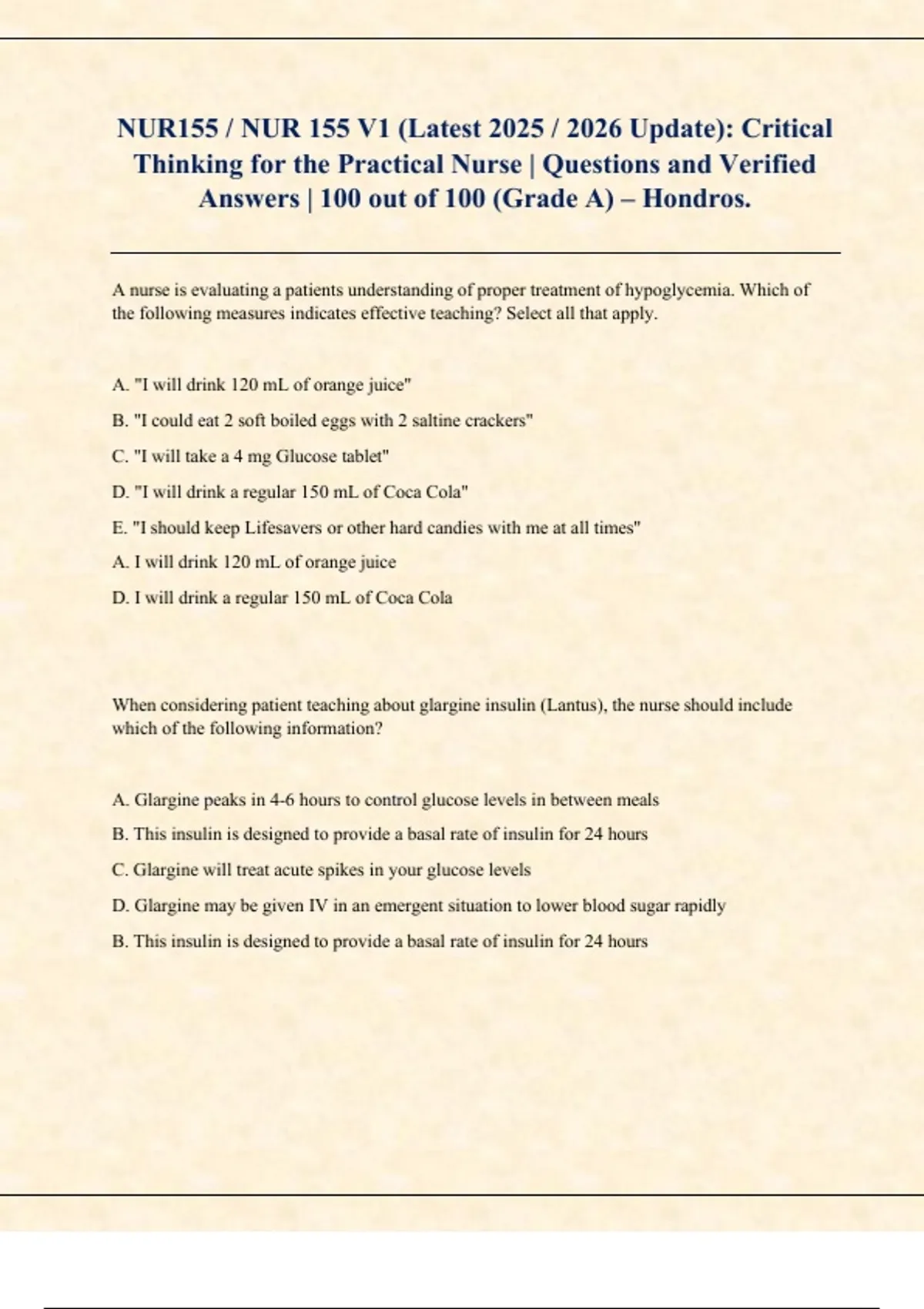 This document provides the full set of questions and verified answers for the course Critical Thinking for the Practical Nurse (NUR 155 V1) at Hondros College. It covers essential critical-thinking concepts, clinical decision-making skills, and practical-nursing reasoning strategies reflected in the 2025–2026 curriculum update. The material is structured to support accurate exam preparation and offers a complete, ready-to-study resource.