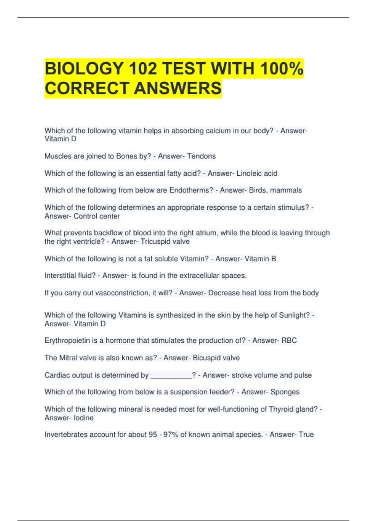 BIOLOGY 102 TEST WITH 100% CORRECT ANSWERS