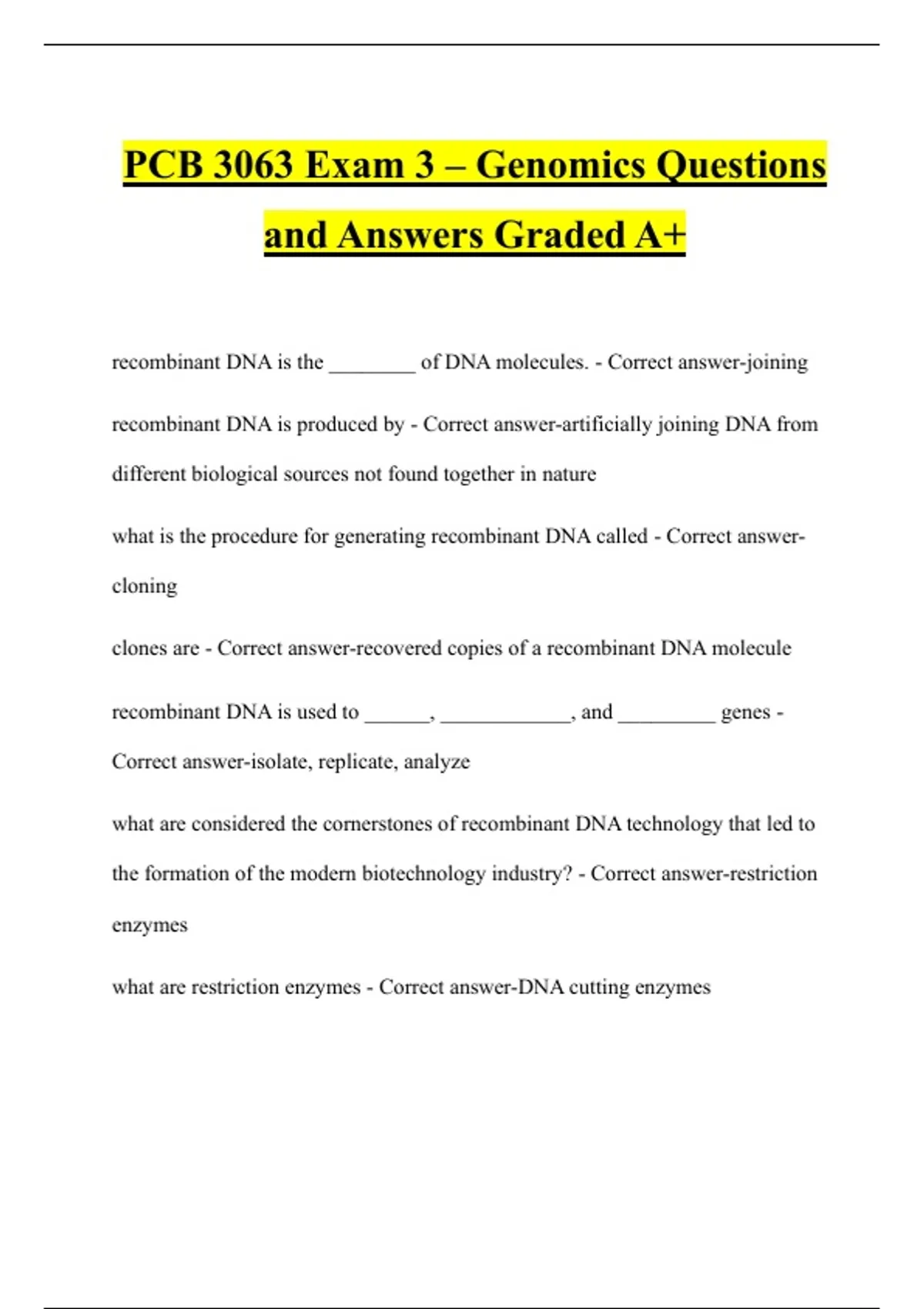 PCB 3063 Exam 3 – Genomics Questions and Answers Graded A+