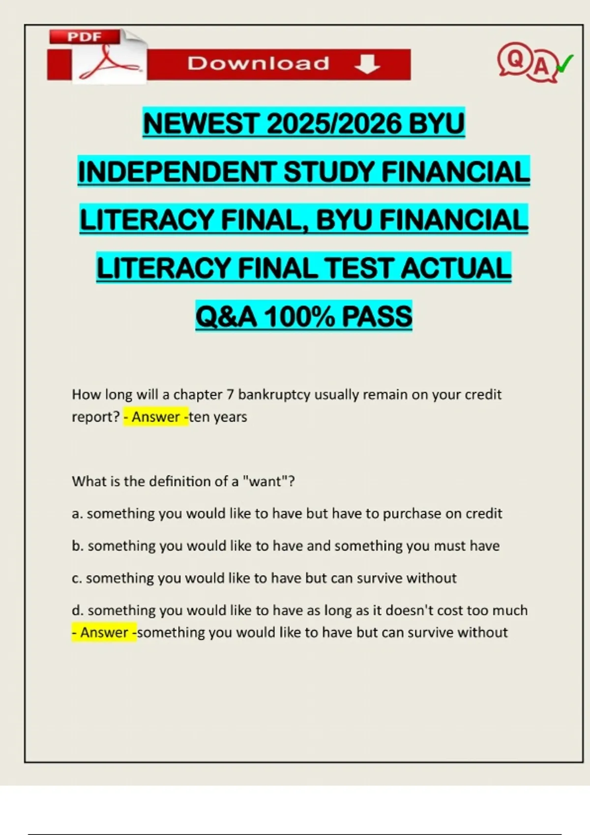 NEWEST 2025/2026 BYU INDEPENDENT STUDY FINANCIAL LITERACY FINAL, BYU FINANCIAL LITERACY FINAL TEST ACTUAL Q&A 100% PASS How long will a chapter 7 bankruptcy usually remain on your credit report? - Answer -ten years What is the definition of a "want"? a. something you would like to have but have to purchase on credit b. something you would like to have and something you must have c. something you would like to have but can survive without d. something you would like to have as long as it doesn't cost too much - Answer -something you would like to have but can survive withoutNeed assistance on Online classes, Exams & Assignments? Reach out for instant help!! Full Course Assistance, Plagiarism-free Essay Writing, Research Paper, Dissertation, Discussion Posts, etc…. Confidential & Secure services. Tutors are available for all subjects! Email now at: A chapter 7 bankruptcy involves which of the following? - Answer -You get a fresh start on your finances Paul wants to purchase a brand new truck. He has to take out a loan from the truck company in order to pay. He will be making payments of $550 a month. If at any time he is unable to pay, the truck company can take Paul's truck from him. Which of the following is the best term for this scenario?