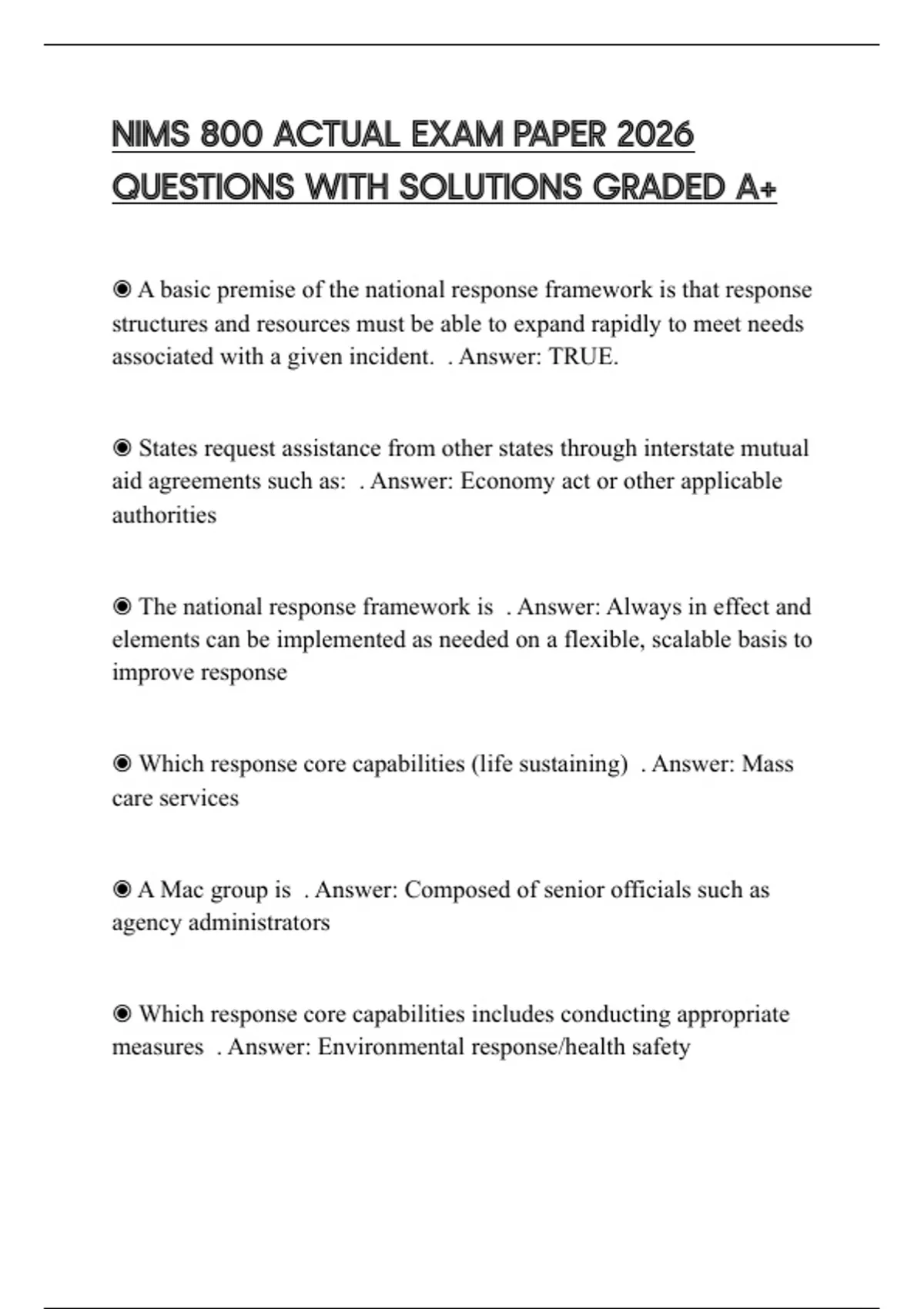 ◉ The national response framework is . Answer: Always in effect and