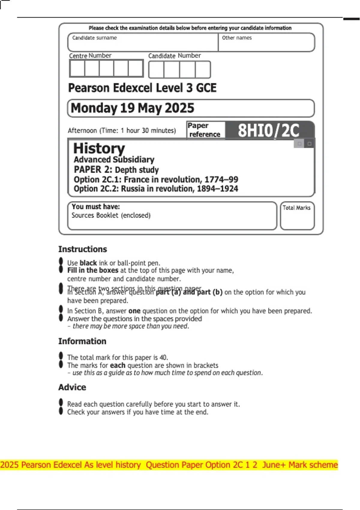 2025 Pearson Edexcel As level history Question Paper Option 2C 1 2 June+ Mark scheme
