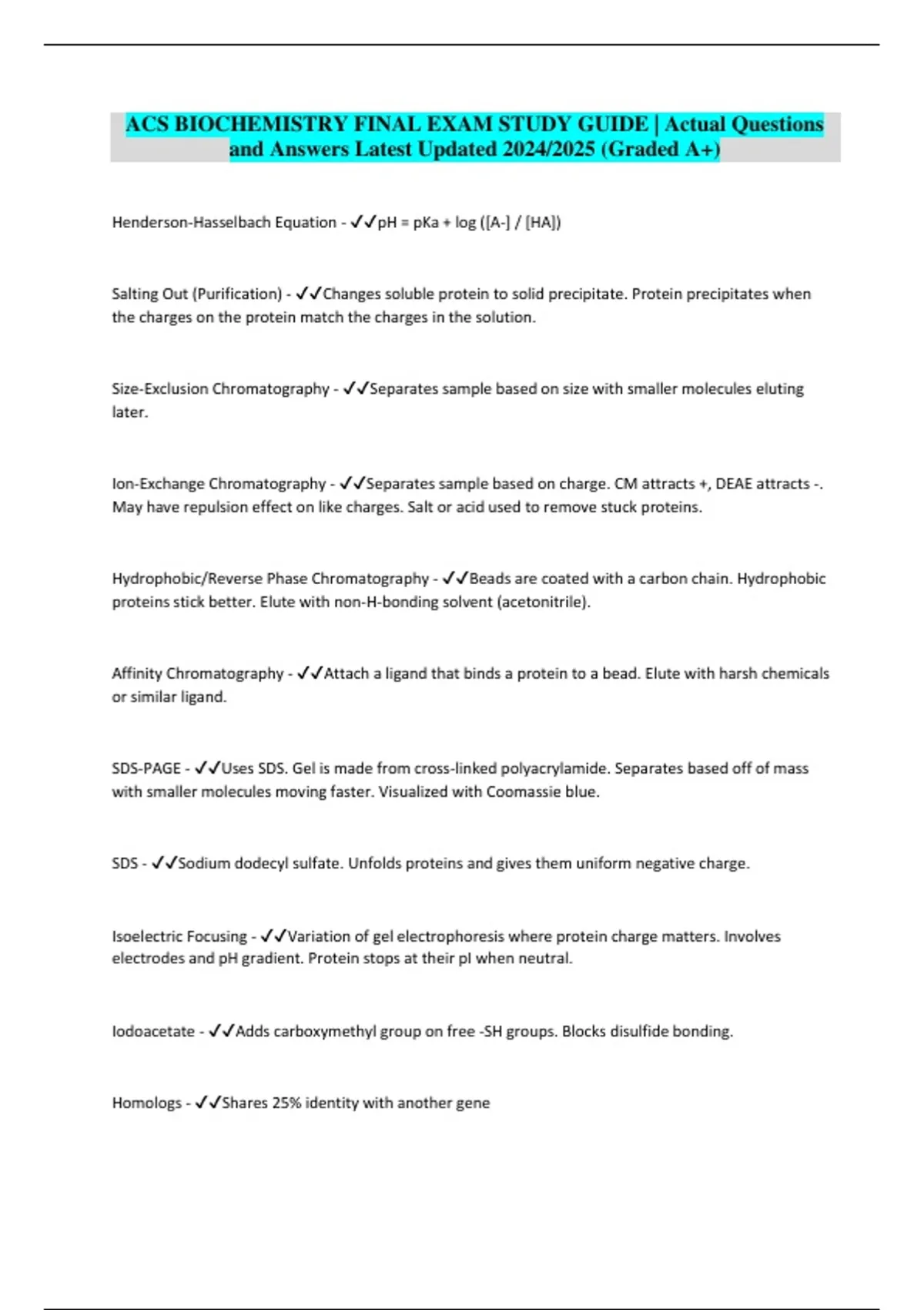 ACS BIOCHEMISTRY FINAL EXAM STUDY GUIDE | Actual Questions and Answers Latest Updated 2024/2025 (Graded A+)Exam (elaborations) Bio chem