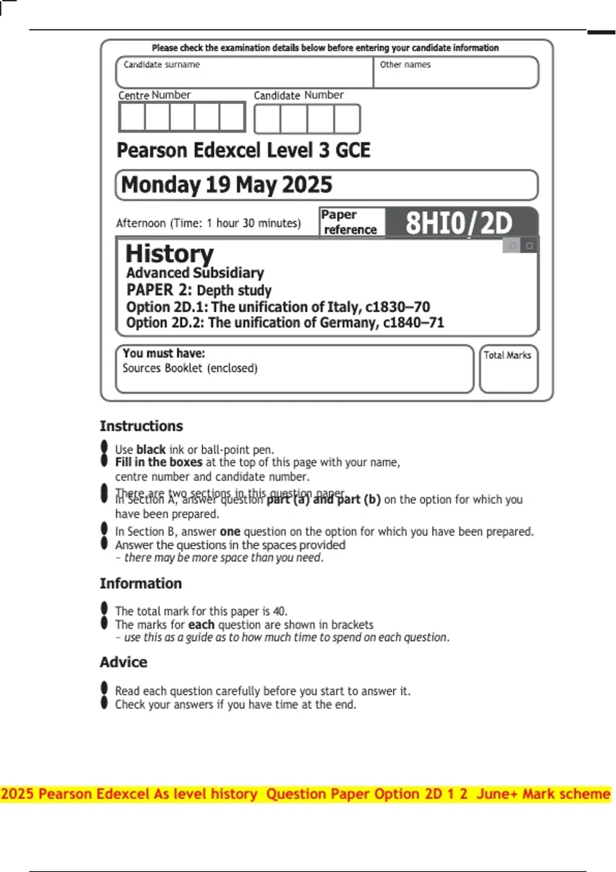 2025 Pearson Edexcel As level history Question Paper Option 2D 1 2 June+ Mark scheme