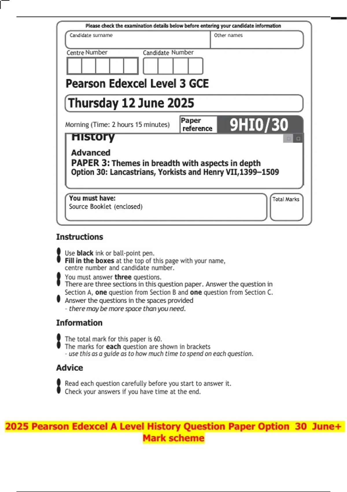2025 Pearson Edexcel A Level History Question Paper Option 30 June+ Mark scheme