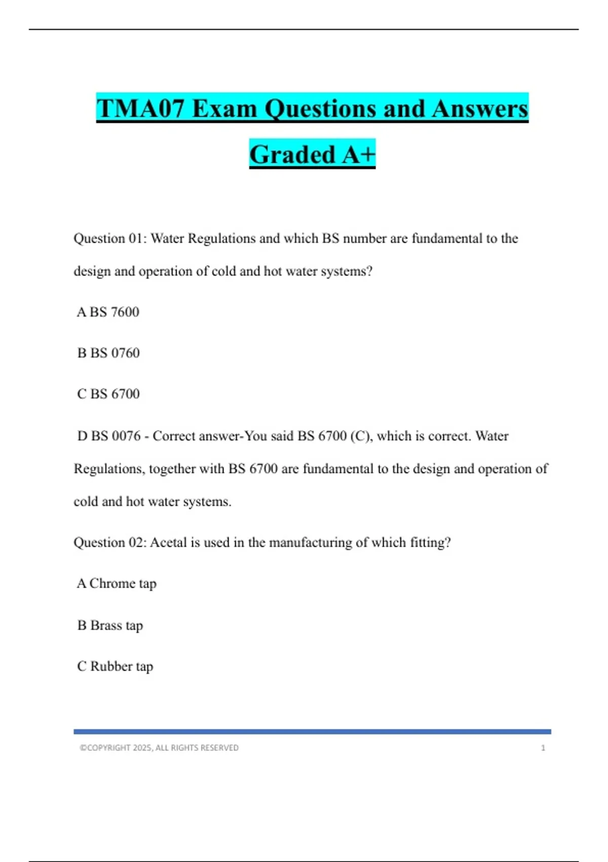 D BS 0076 - Correct answer-You said BS 6700 (C), which is correct. Water