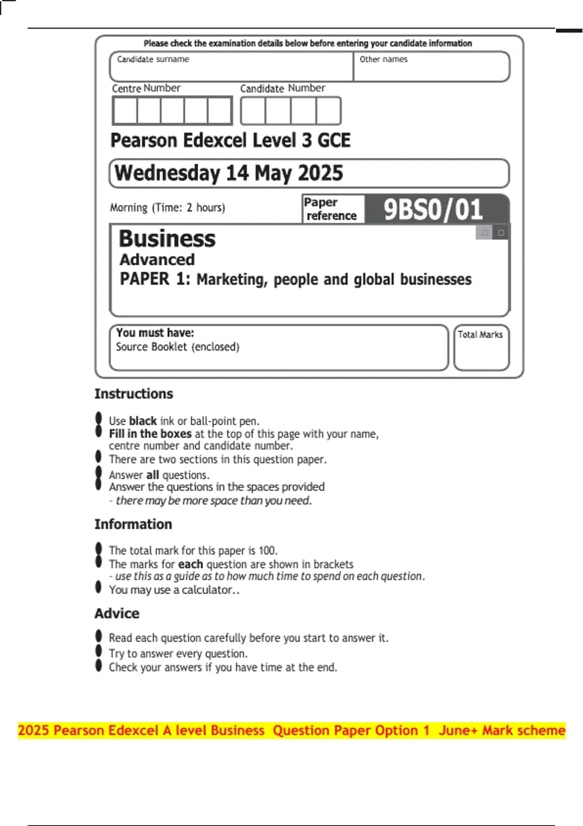 2025 Pearson Edexcel A level Business Question Paper Option 1 June+ Mark scheme