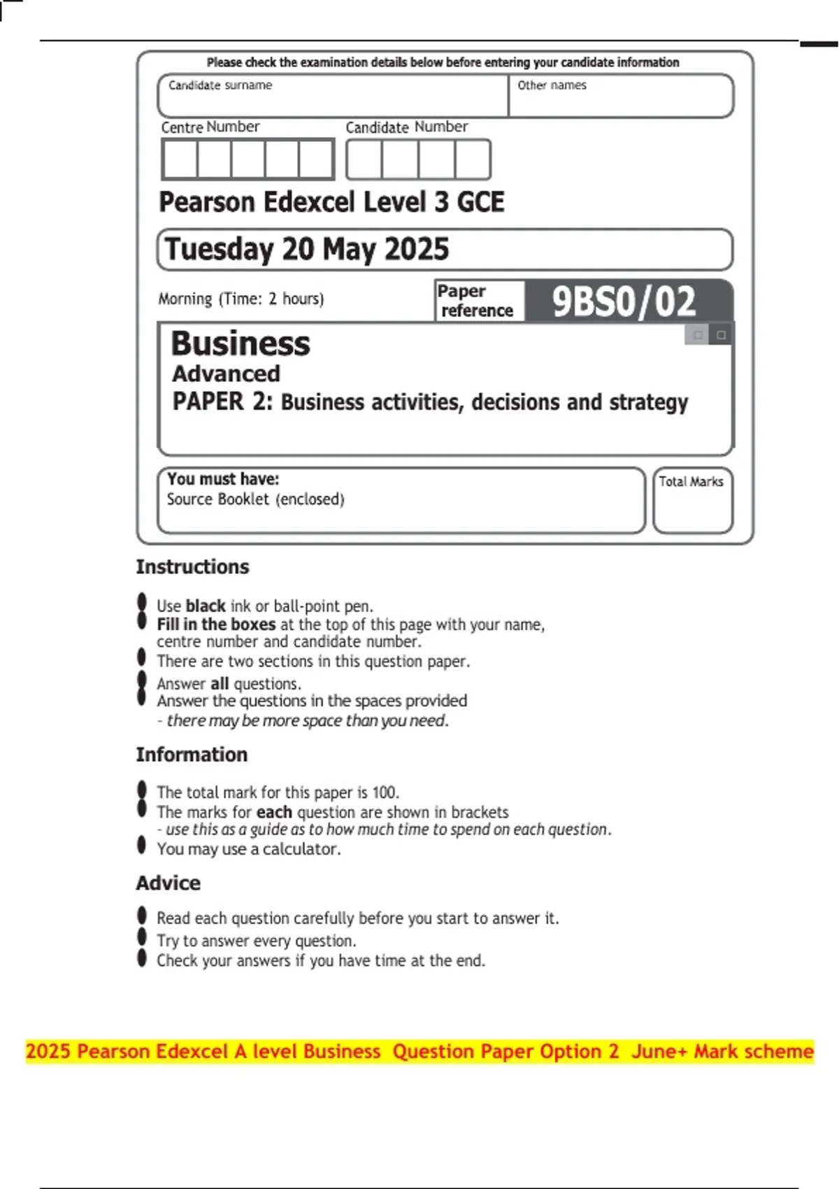 2025 Pearson Edexcel A level Business Question Paper Option 2 June+ Mark scheme
