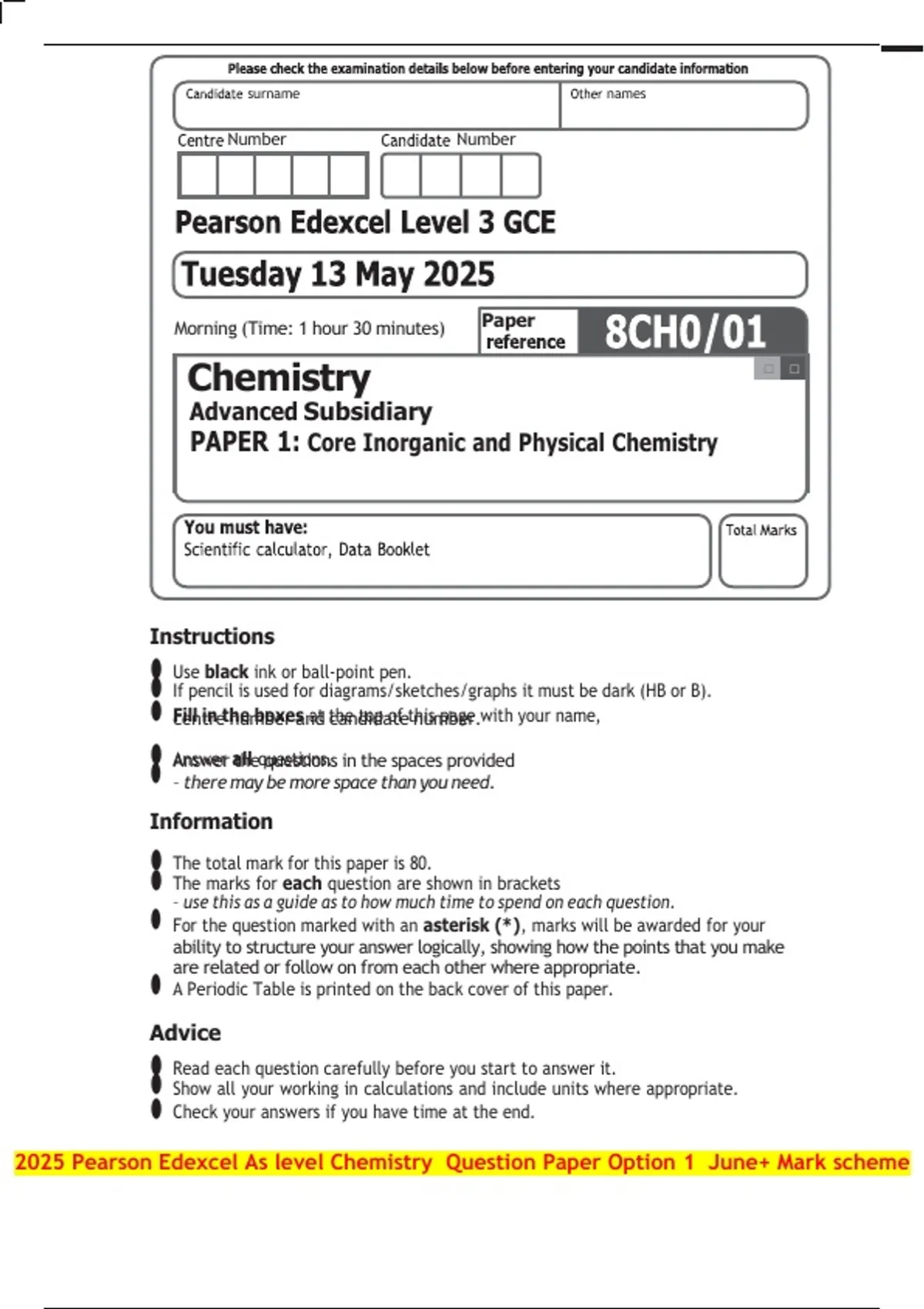 2025 Pearson Edexcel As level Chemistry Question Paper Option 1 June+ Mark scheme