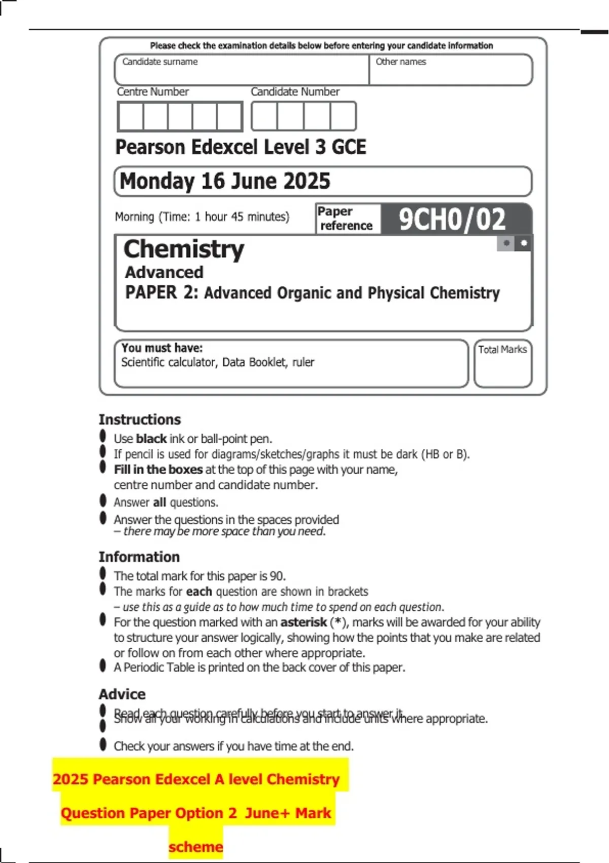 2025 Pearson Edexcel A level Chemistry Question Paper Option 2 June + Mark scheme