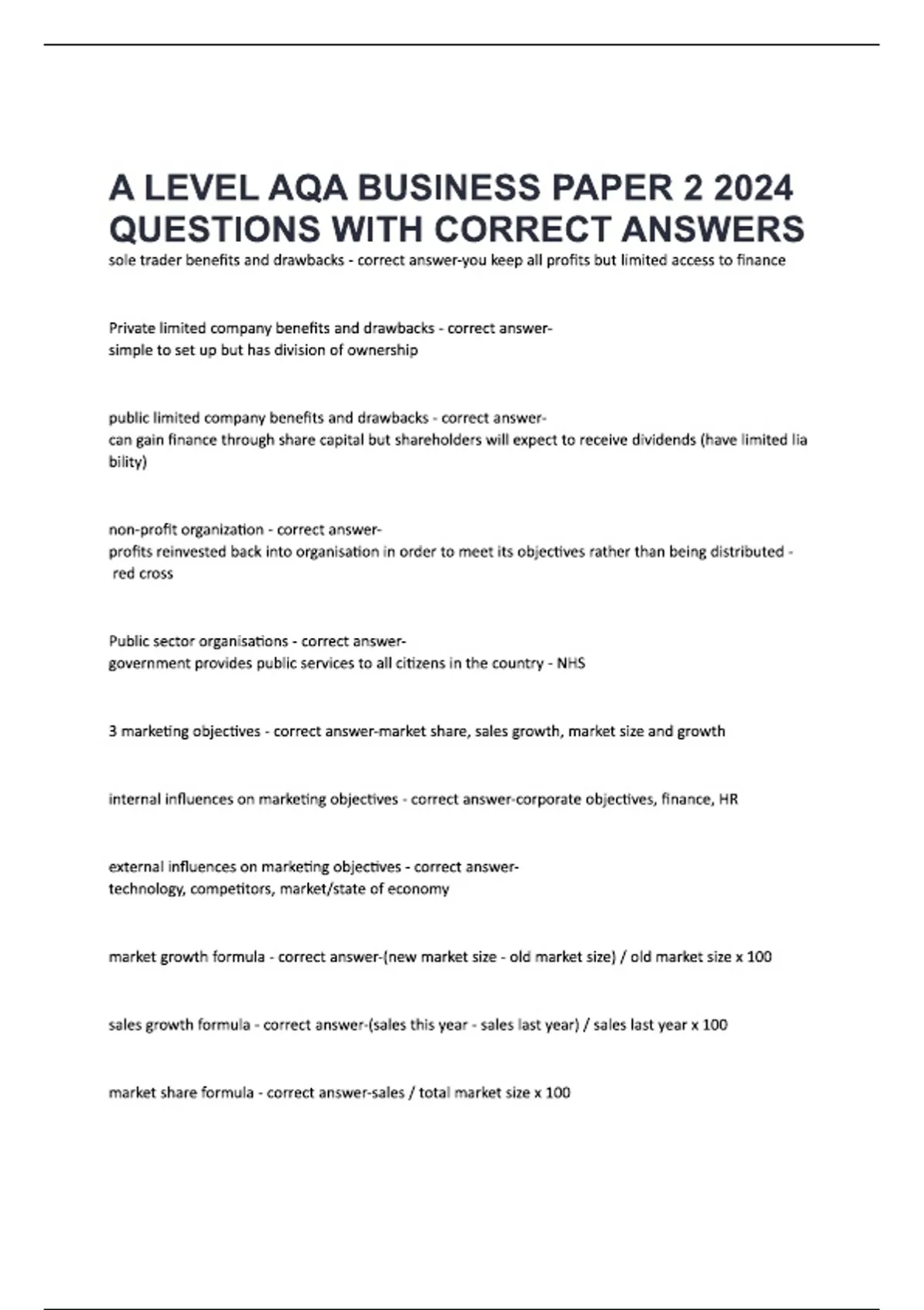 A LEVEL AQA BUSINESS PAPER 2 2026 QUESTIONS WITH CORRECT ANSWERS.
